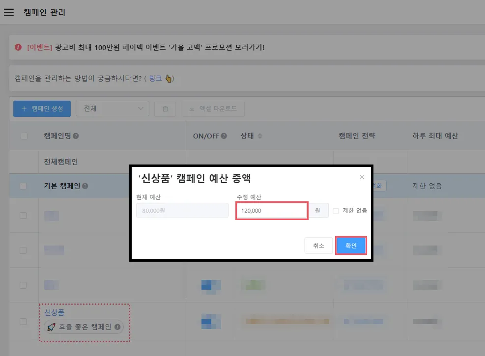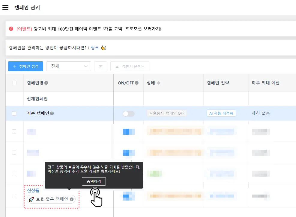 ‘효율 좋은 캠페인’ 마우스 오버 시 보이는 ‘증액하기’ 버튼을 클릭하세요.
