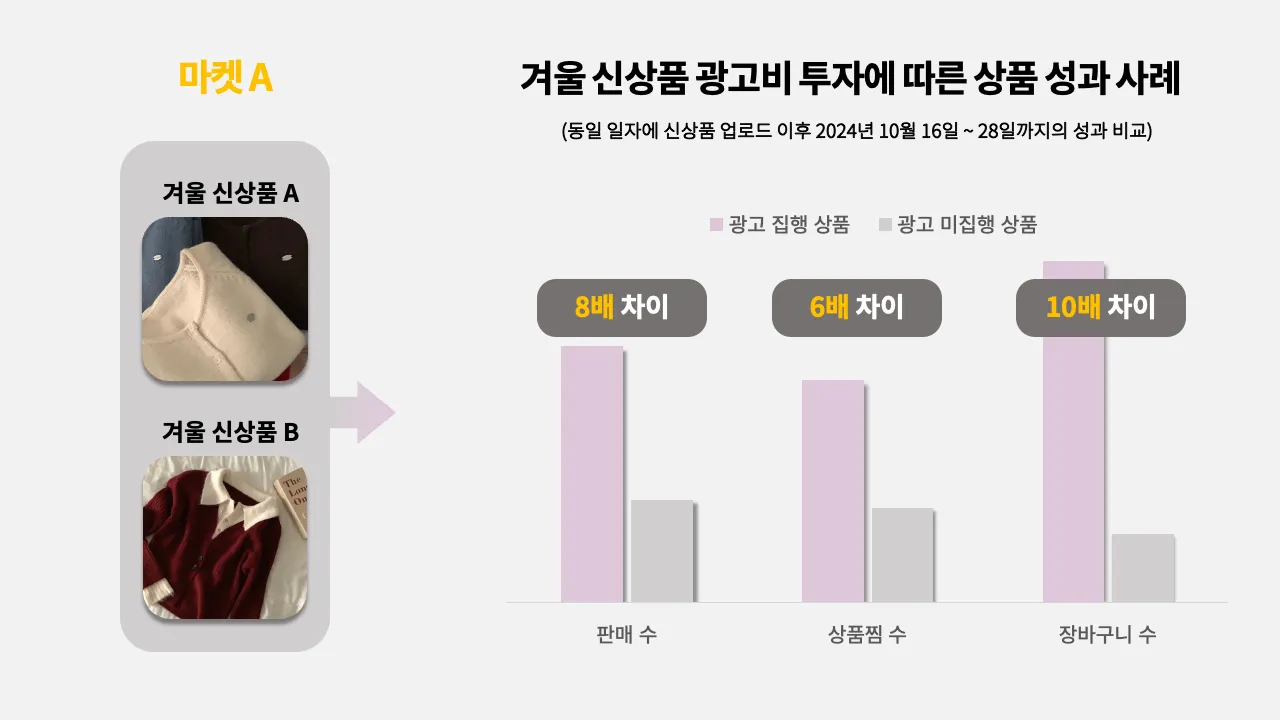 마켓 A는 10월 3주차 업데이트 된 겨울 신상품 중 상품A를 바로 광고 운영하였습니다. 광고를 미진행한 상품B에 비해 상품A의 노출량이 큰폭으로 증가하여, 12일 이내 판매 수가 8배 더 빠르게 성장하는 큰 차이를 보였습니다!