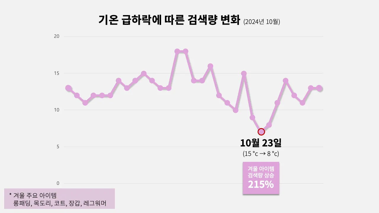 기온이 급격히 하강하는 시기는 겨울 아이템에 대한 수요가 급증하는 시기입니다! 다음 주부터는 기온이 본격적으로 한 자릿수로 떨어질 예정이니, 겨울 상품 노출을 위한 기회를 놓치지 마세요!
