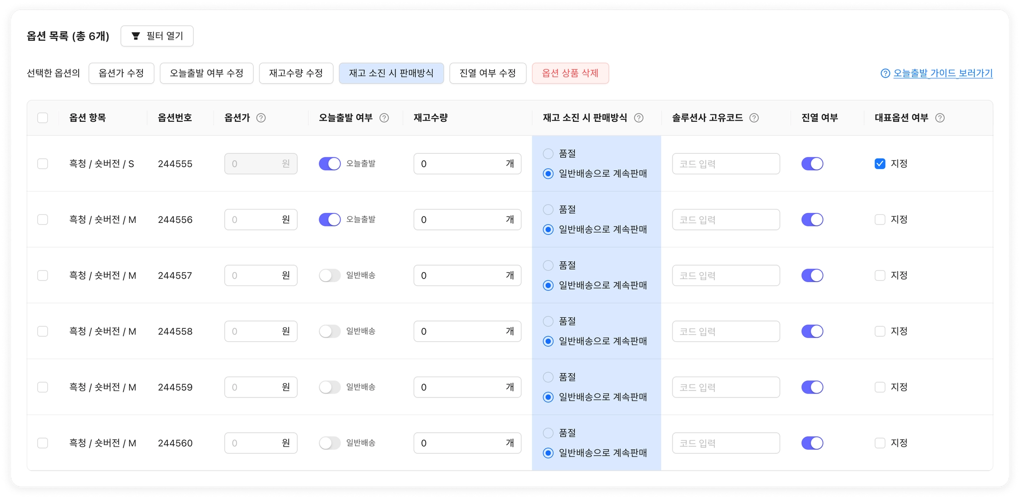 재고가 모두 소진되었을 때 옵션을 품절시킬지, 일반배송으로 계속 판매할지 결정하는 항목입니다.