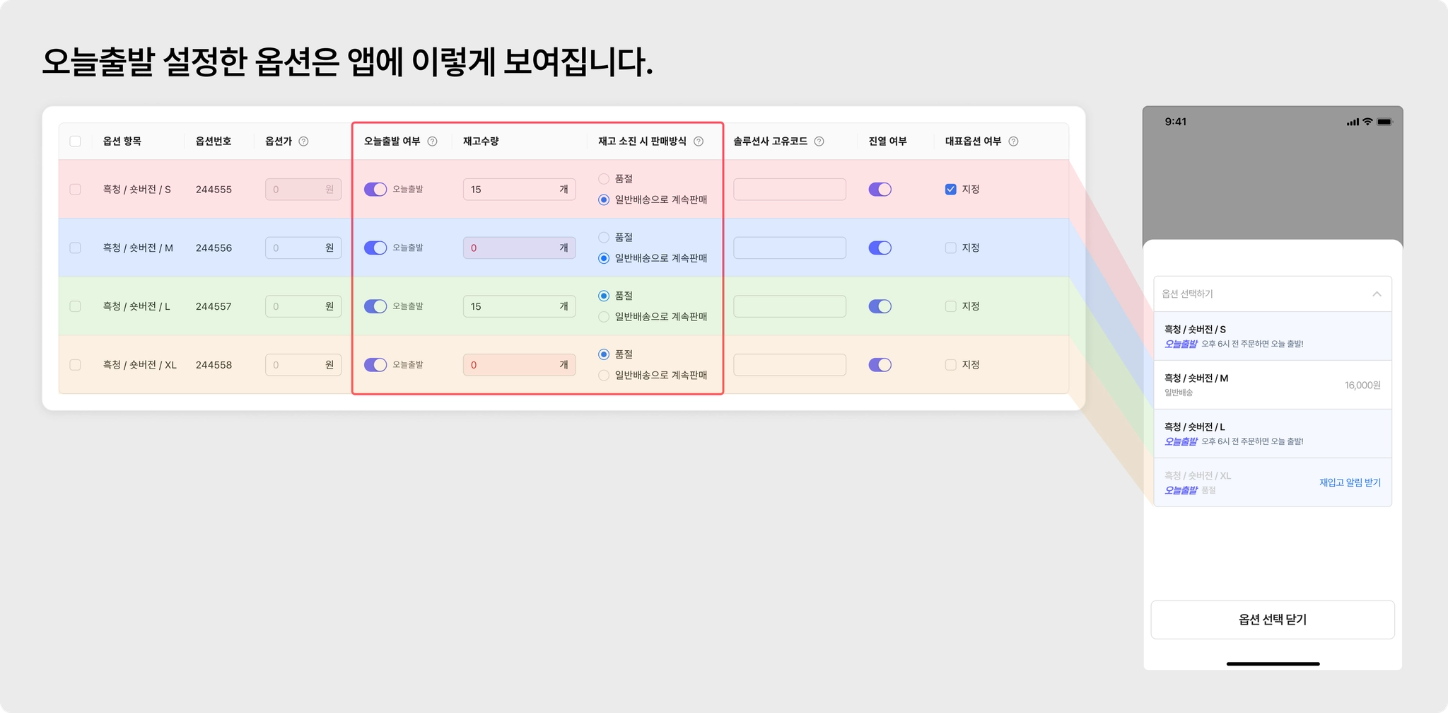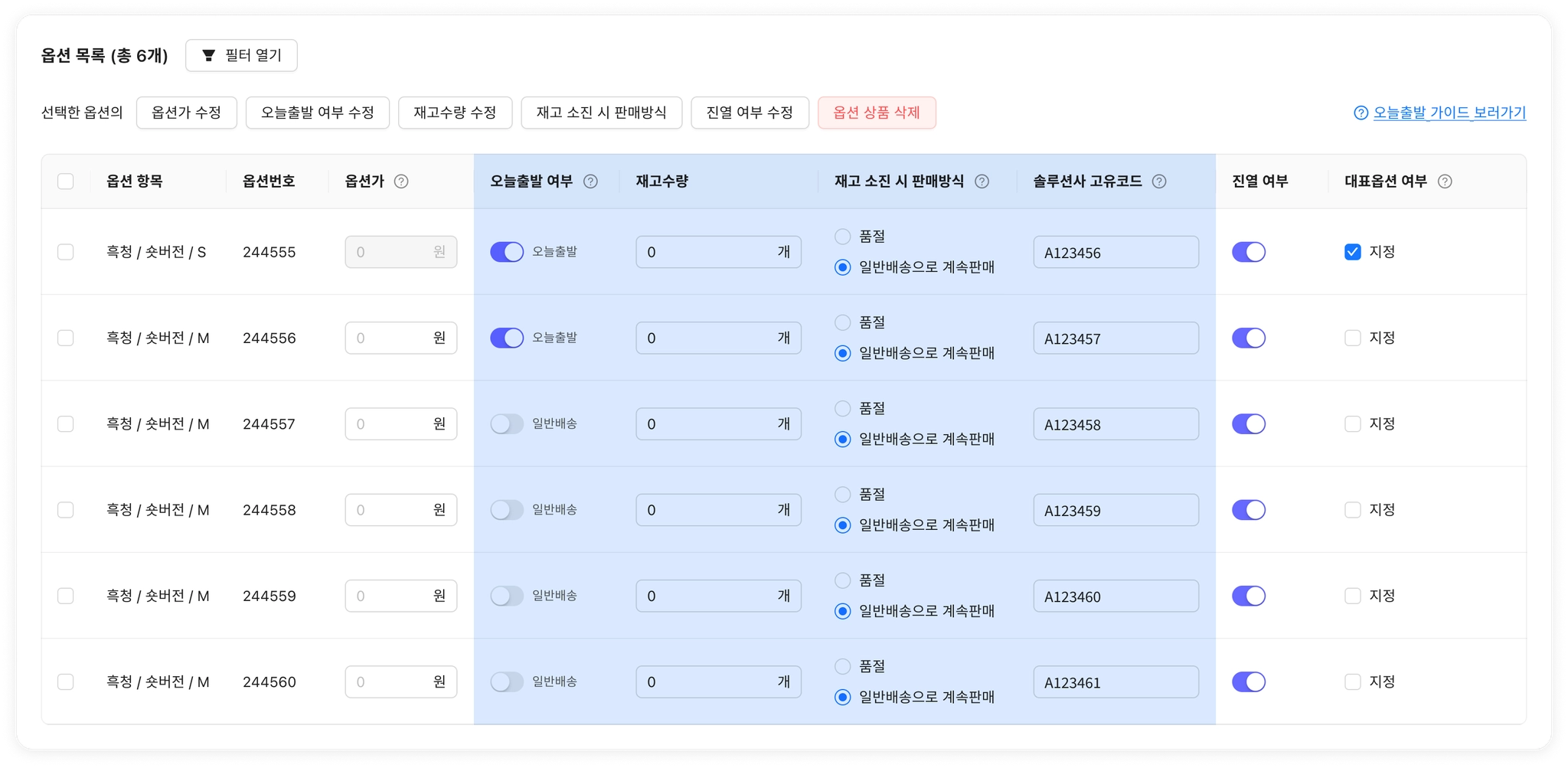 오늘출발로 판매 가능한 옵션만 오늘출발로 설정해 주세요.