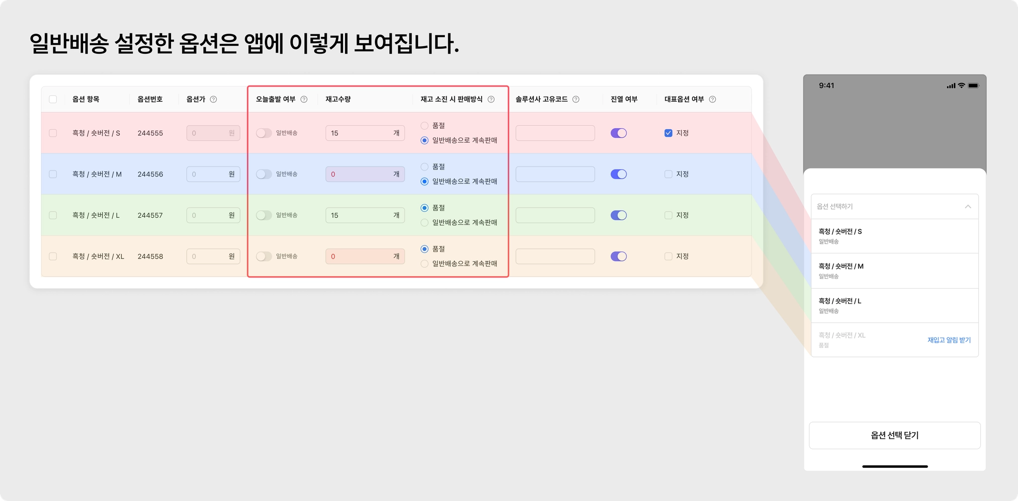 재고수량에 입력한 수량이 0이 되었을 때, 옵션을 품절 처리할지 일반배송으로 계속 판매할지 설정하는 항목입니다.