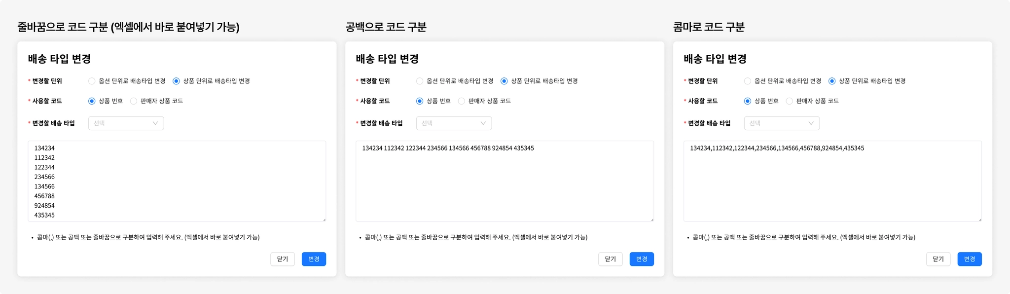 상품 단위로 배송타입 변경 : 입력한 상품 하위의 모든 옵션을 선택한 배송타입으로 변경합니다.