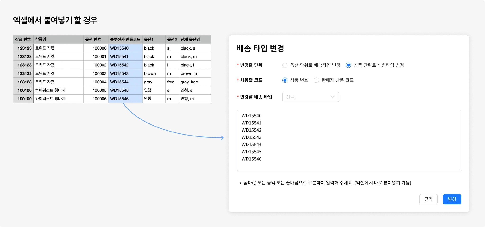 엑셀 파일에서 상품, 옵션번호를 가져올 경우, 해당 열을 그대로 복사해서 입력란에 붙여넣습니다.