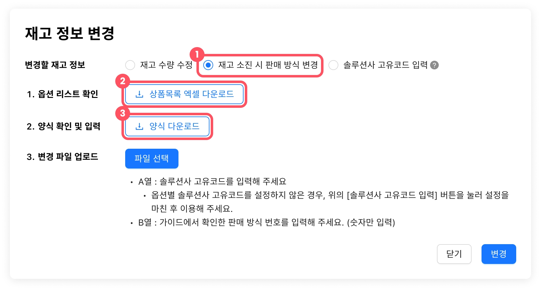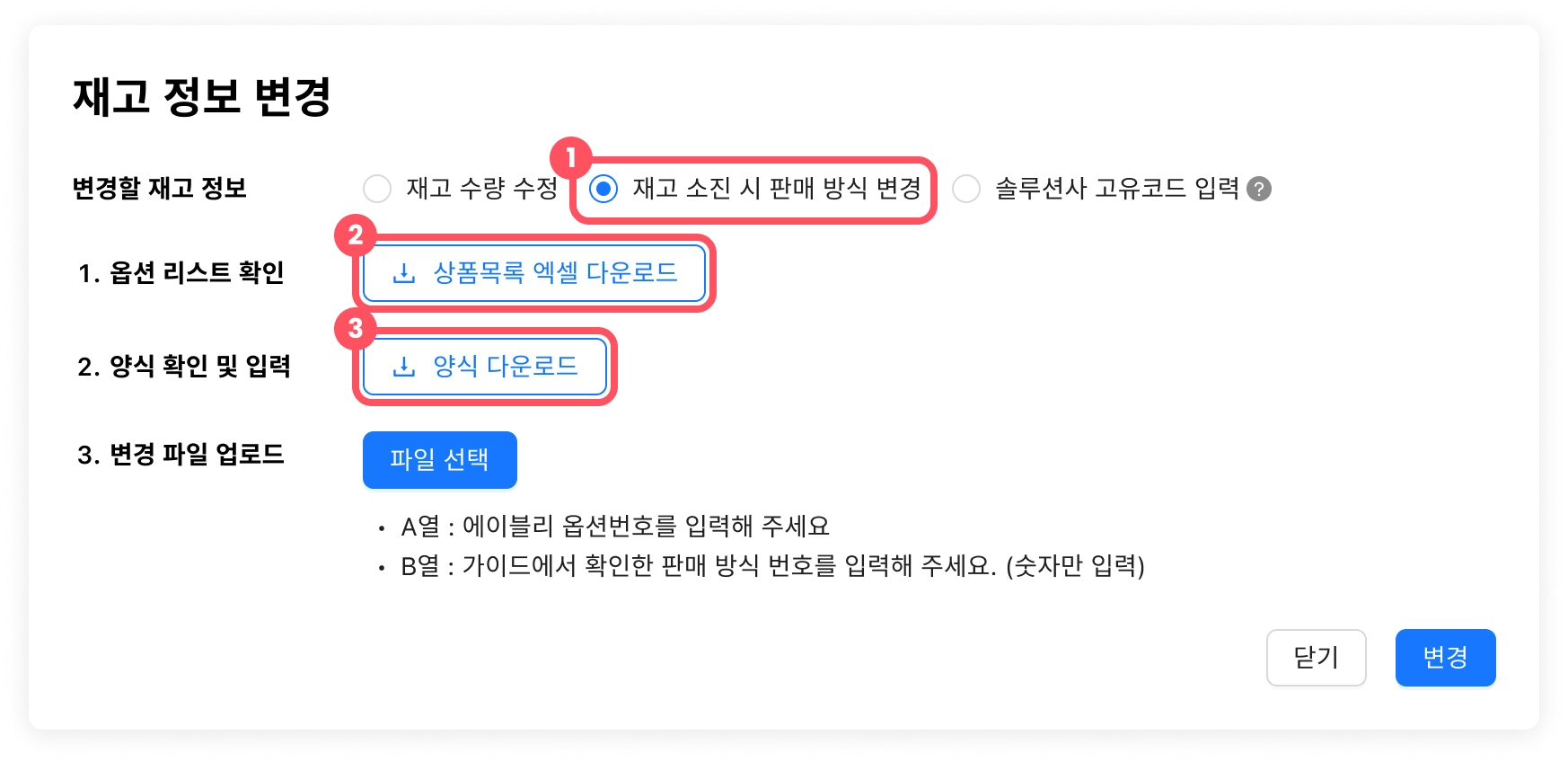 양식 B열에 재고 소진 시 판매 방식을 번호로 입력합니다.