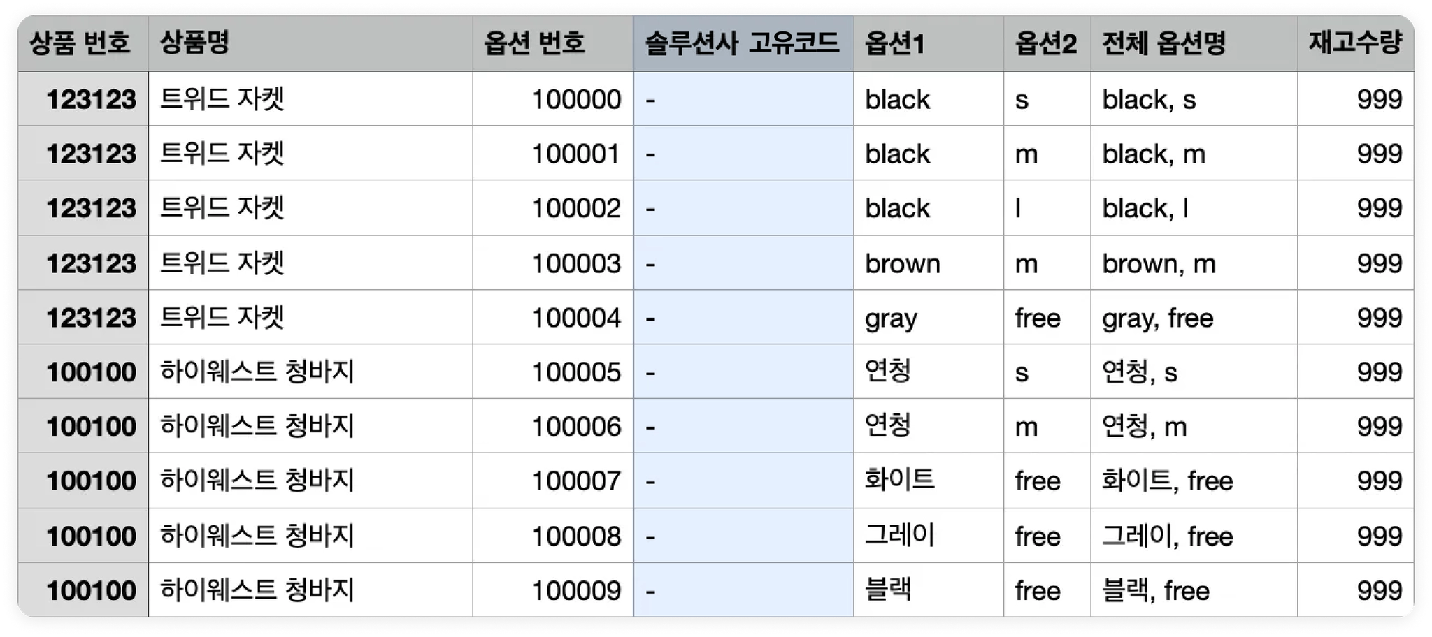솔루션사 고유코드로 사용할 옵션별 고유 코드