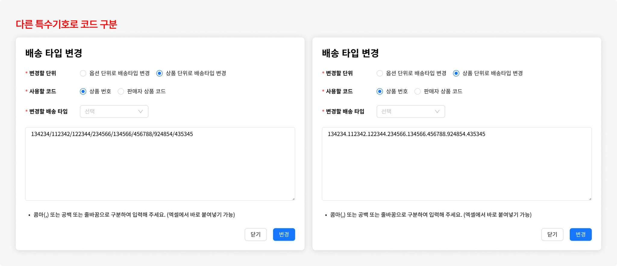 상품 단위로 배송타입 변경 시 : 상품 번호나 판매자 상품 코드를 사용할 수 있습니다.