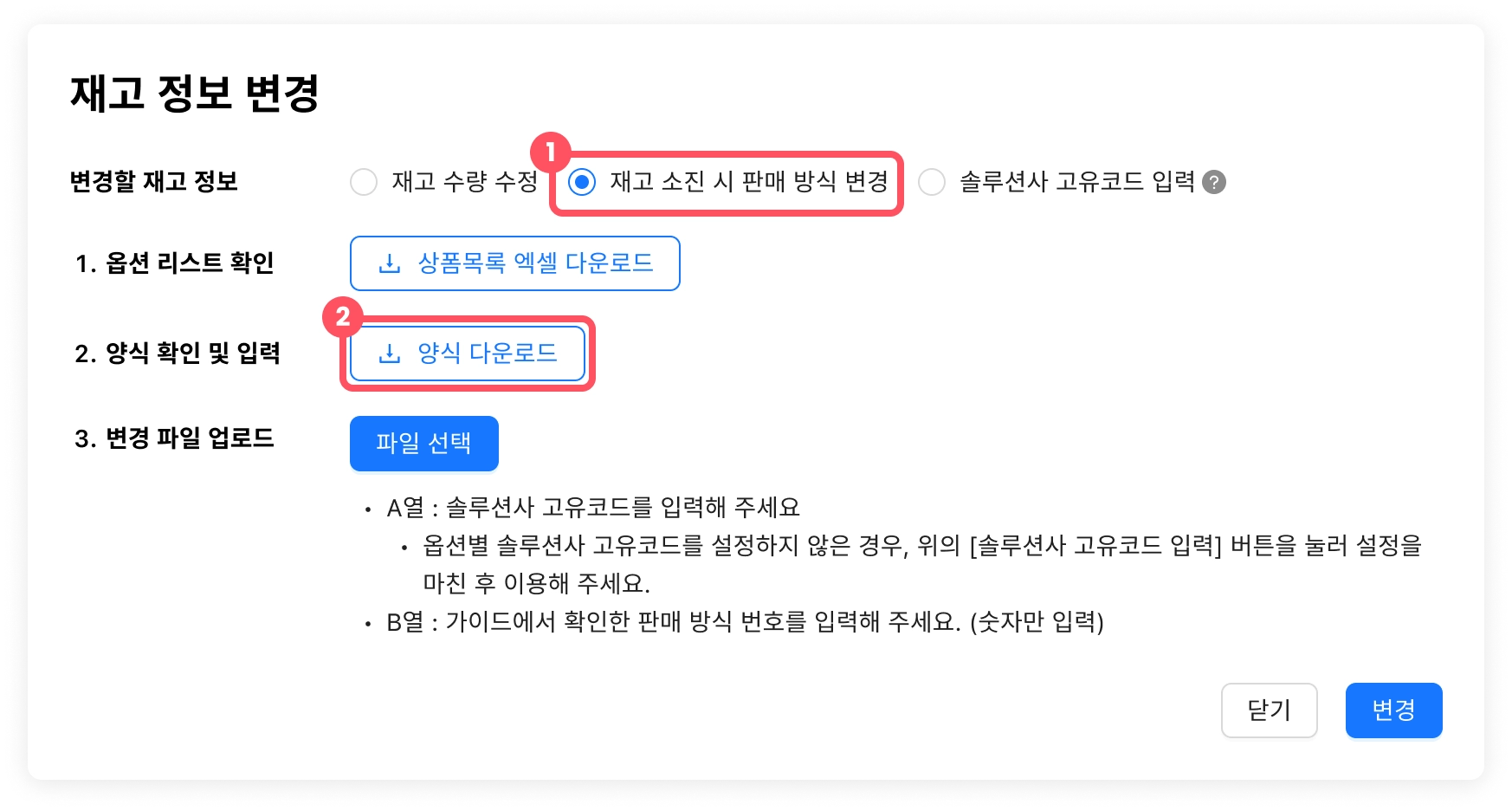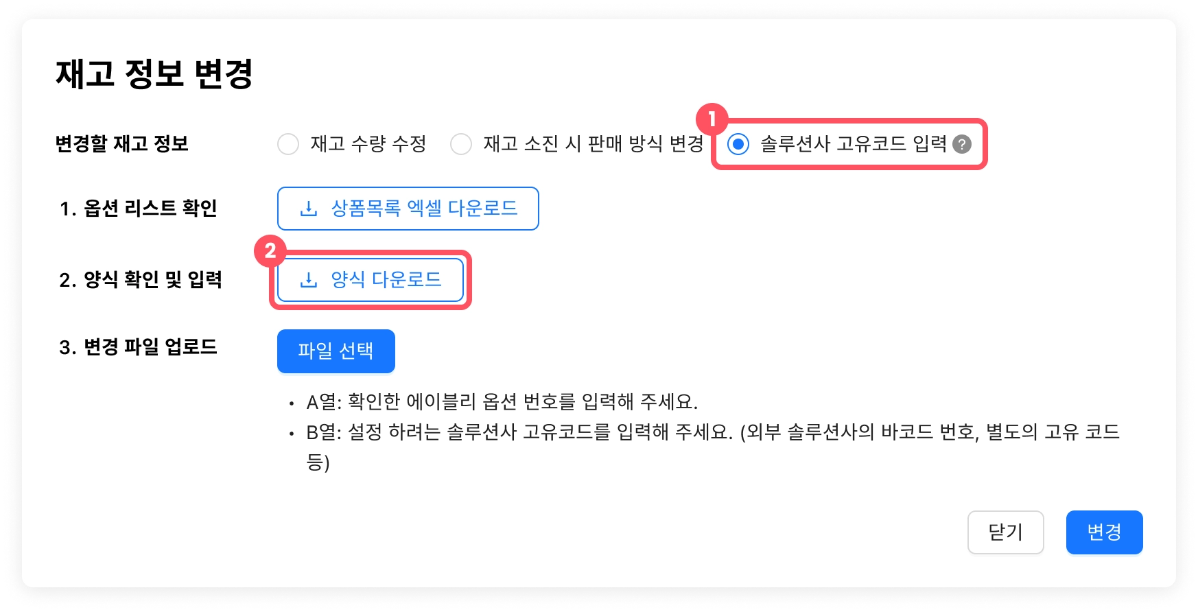 이제 솔루션사 고유코드가 포함된 엑셀을 양식에 맞춰 업로드하면, 옵션 정보(재고 수량, 재고 소진 시 판매 방식 등)를 일괄 변경할 수 있습니다.
