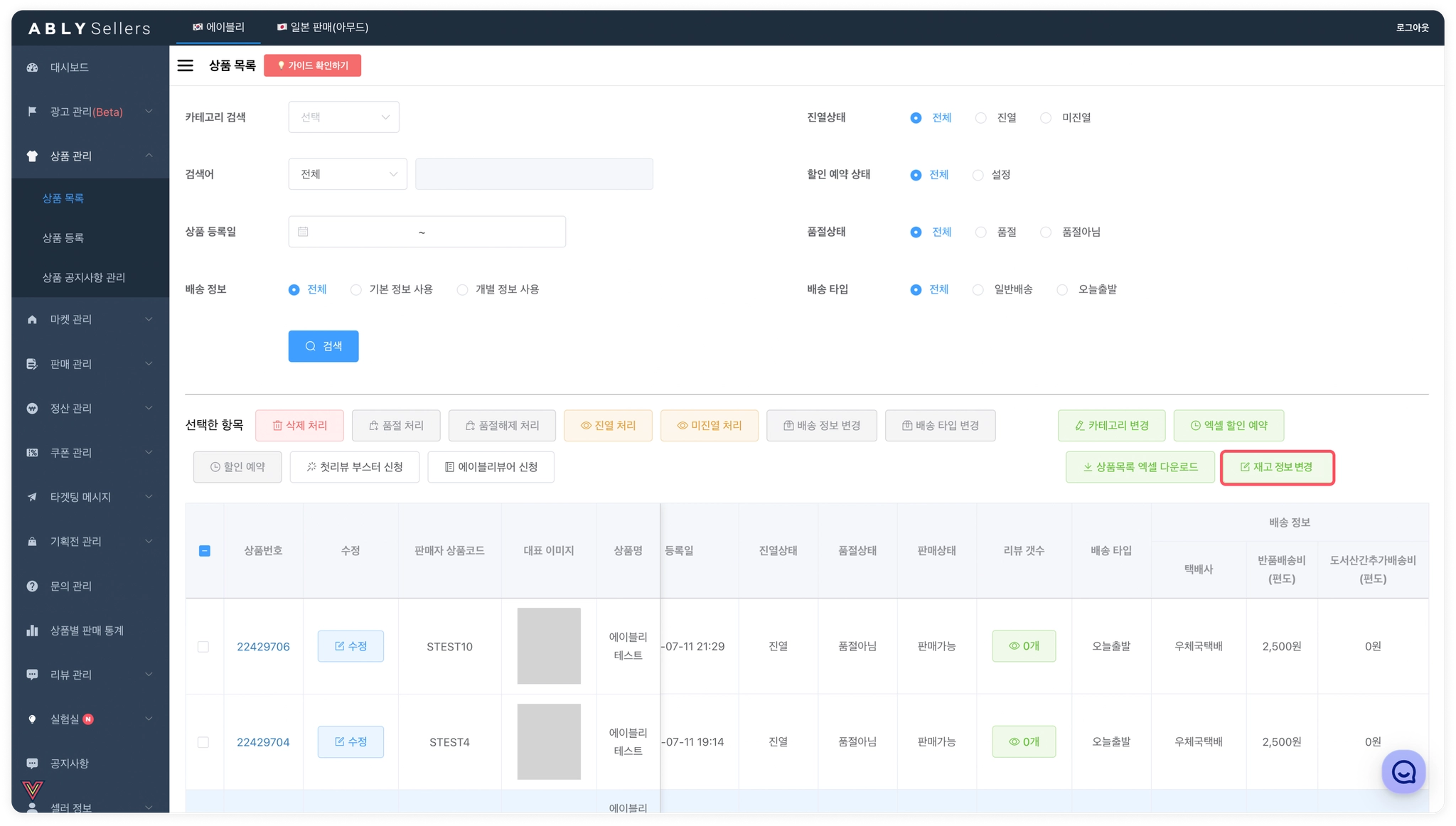 상품 목록 화면에서 재고 정보 변경을 누릅니다.