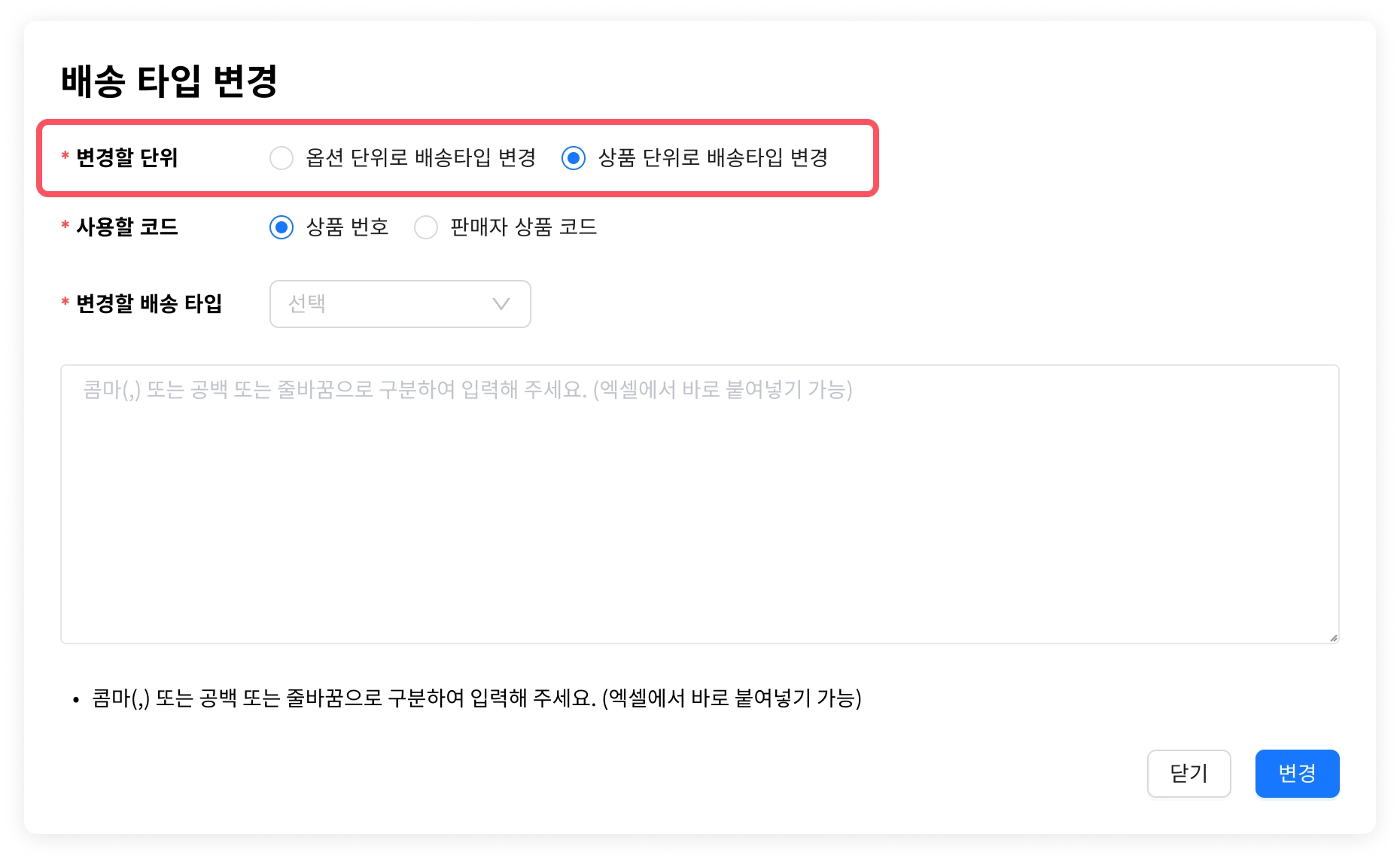 상품 단위로 배송타입 변경 : 입력한 상품 하위의 모든 옵션을 선택한 배송타입으로 변경합니다.