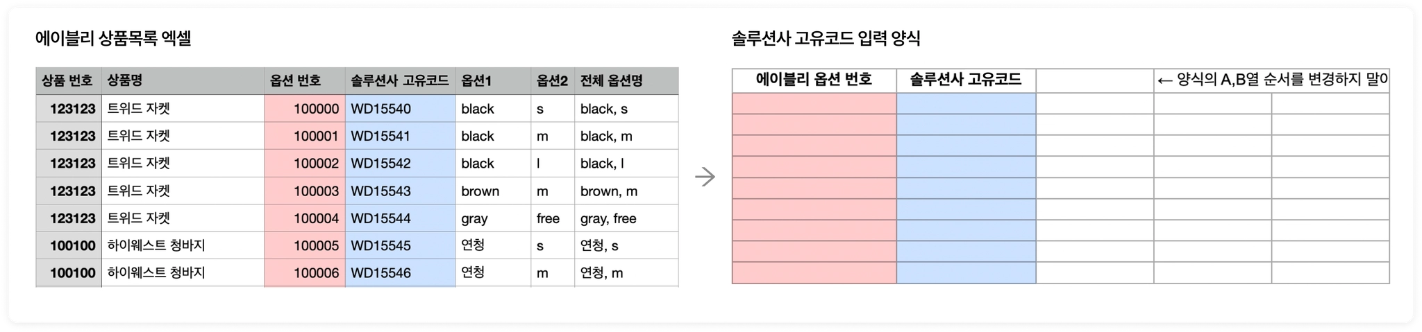 옵션 번호를 양식 A열 - 에이블리 옵션 번호에,