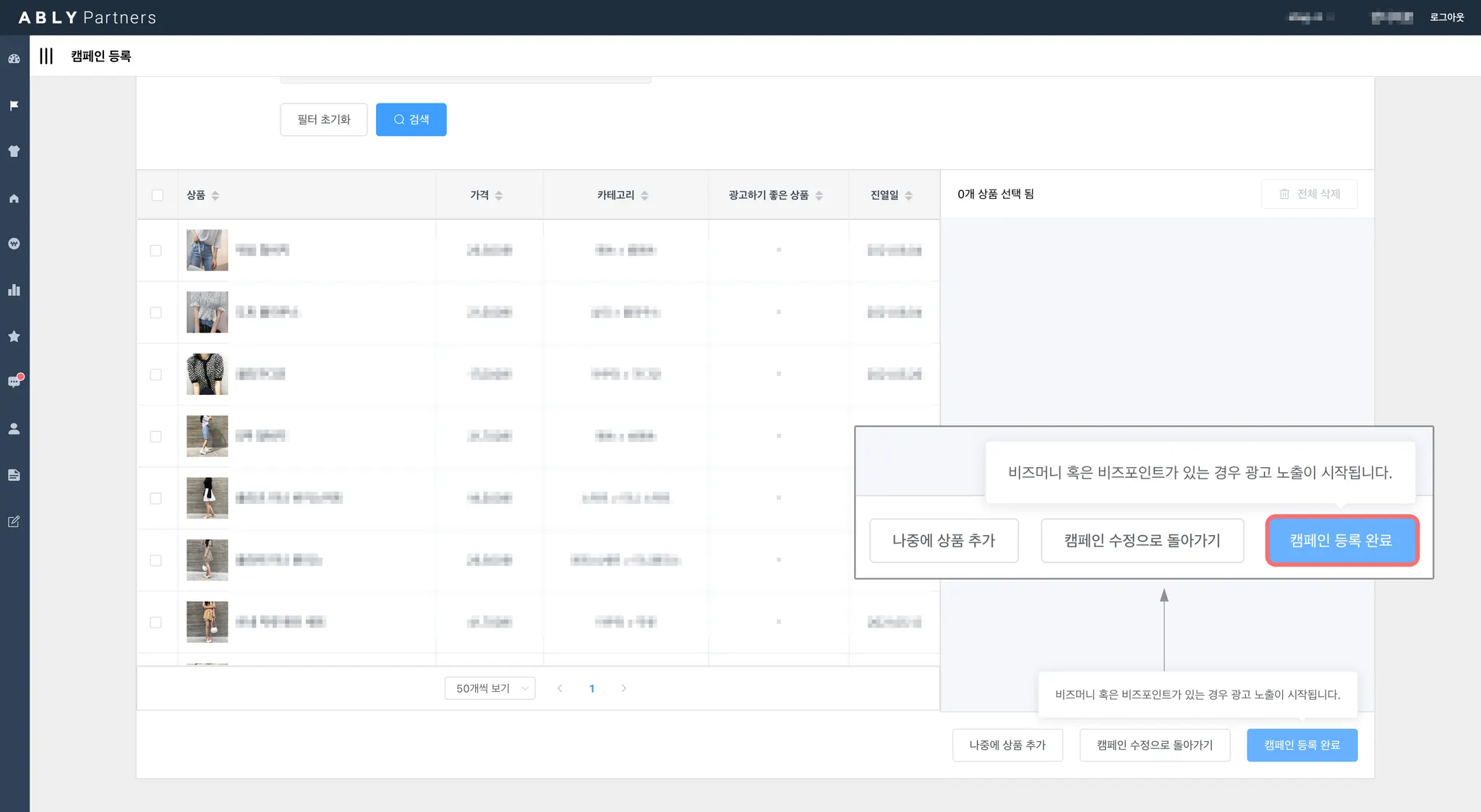 상품 선택 후 ‘캠페인 등록 완료’ 버튼을 클릭하세요. (캠페인 상세 페이지로 이동)