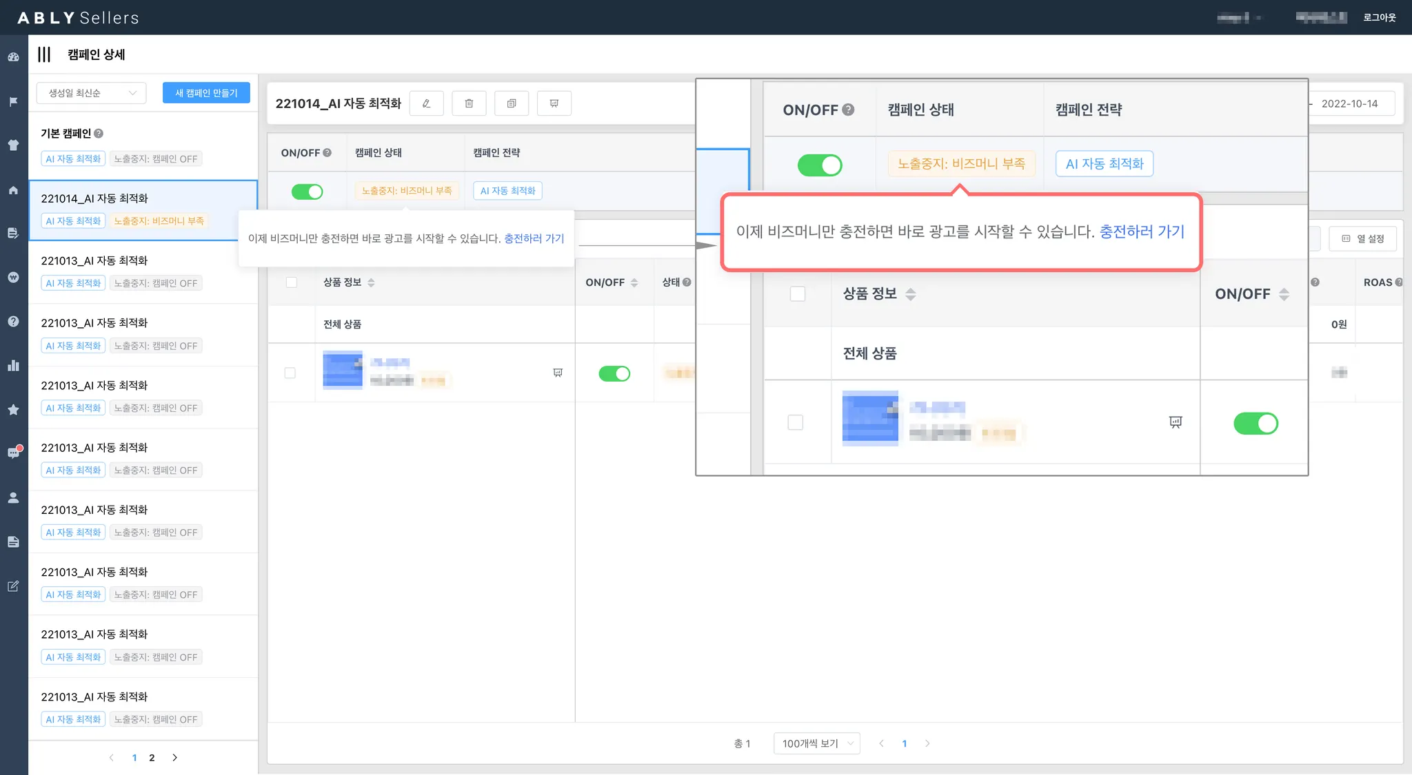 캠페인 ON, 상품 ON 상태이기 때문에, 비즈머니만 충전하면 바로 광고가 노출됩니다.