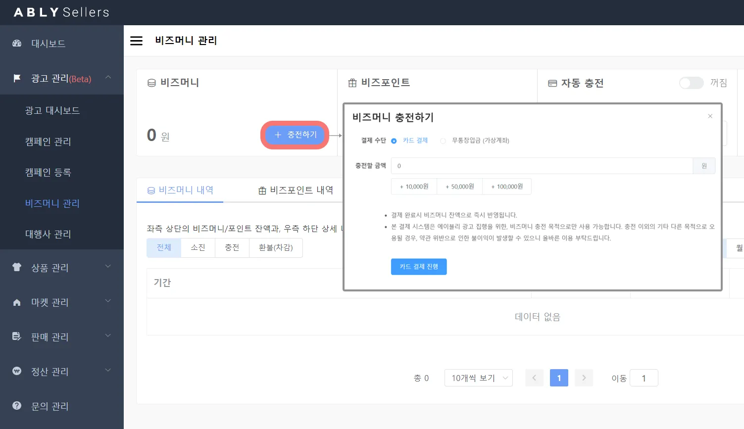 ‘충전하기’ 버튼을 클릭하세요. 비즈머니는 카드 결제/무통장입금 모두 가능합니다.
