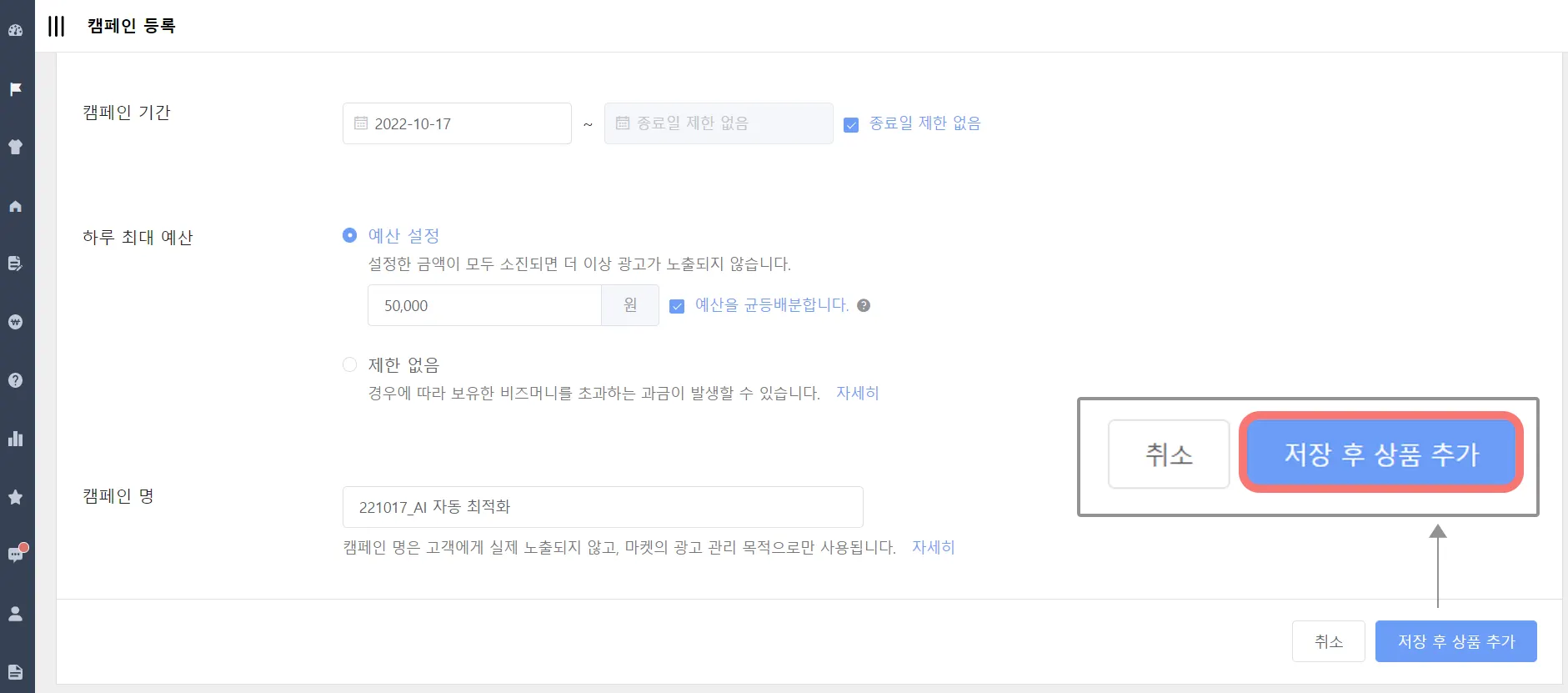 4가지 항목(운영 전략/기간/예산/캠페인 명) 입력 후 ‘저장 후 상품 추가’ 버튼을 클릭하세요.