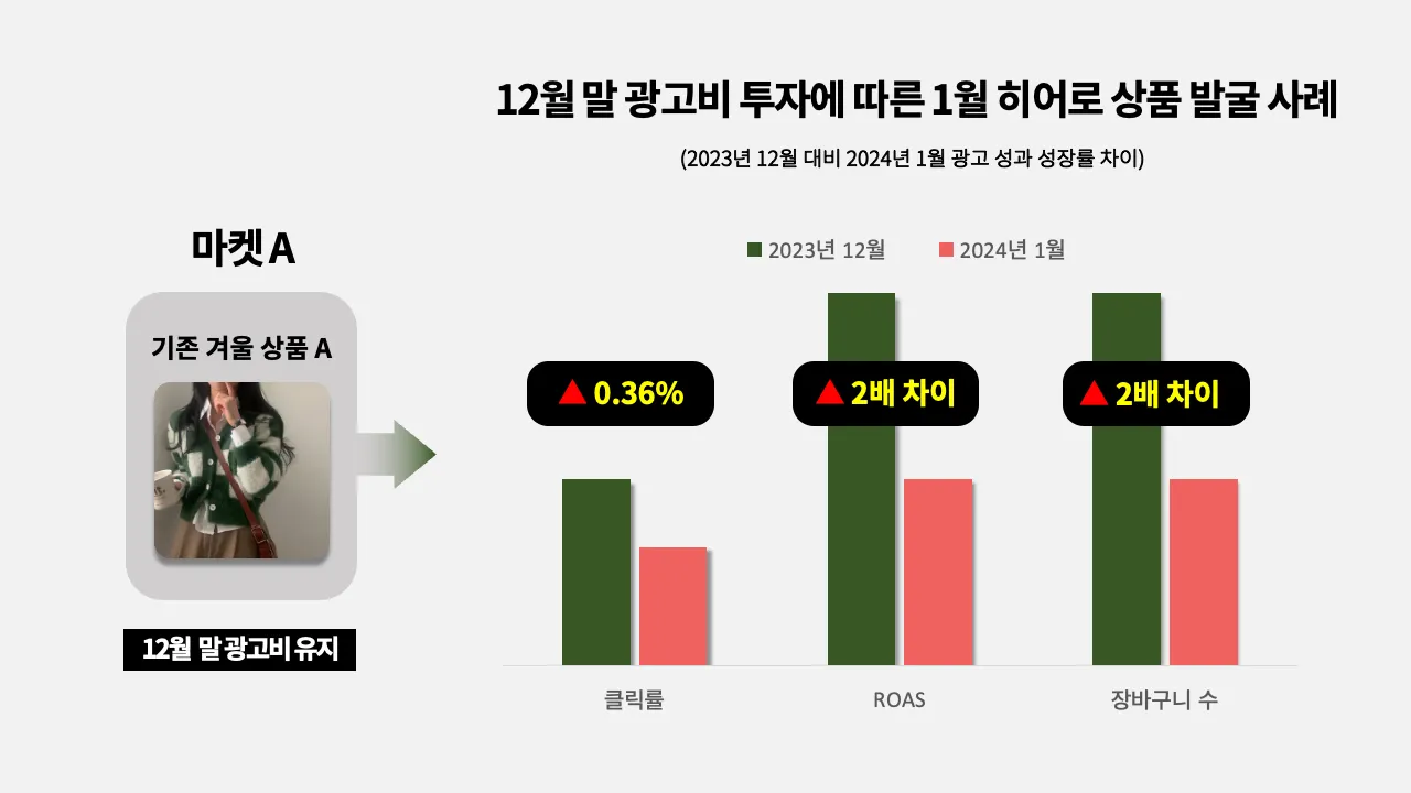 마켓A는 지난 23년 12월 말 광고비를 유지하여 기존 겨울 상품A의 광고 운영에 집중하였습니다. 상품의 노출량을 꾸준히 이어간 결과, 상품A의 광고 성과(클릭률, ROAS, 장바구니 수)를 12월 달 대비 큰 폭으로 높이며 다음 해 1월 히어로 상품으로 자리 잡았습니다! 이렇듯, 연말 광고 운영은 올해 겨울 집중 상품을 내년 1월부터 주력 상품으로 만들 수 있는 성장의 기회입니다!