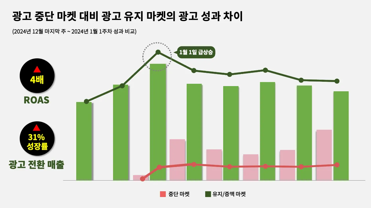 작년 연말 광고 운영에 집중하여 투자한 마켓은 광고를 중단한 마켓에 비해 1월 1일부터 31% 더 성장한 광고 전환 매출과 4배 높은 ROAS를 안정적으로 확보해 나갔습니다