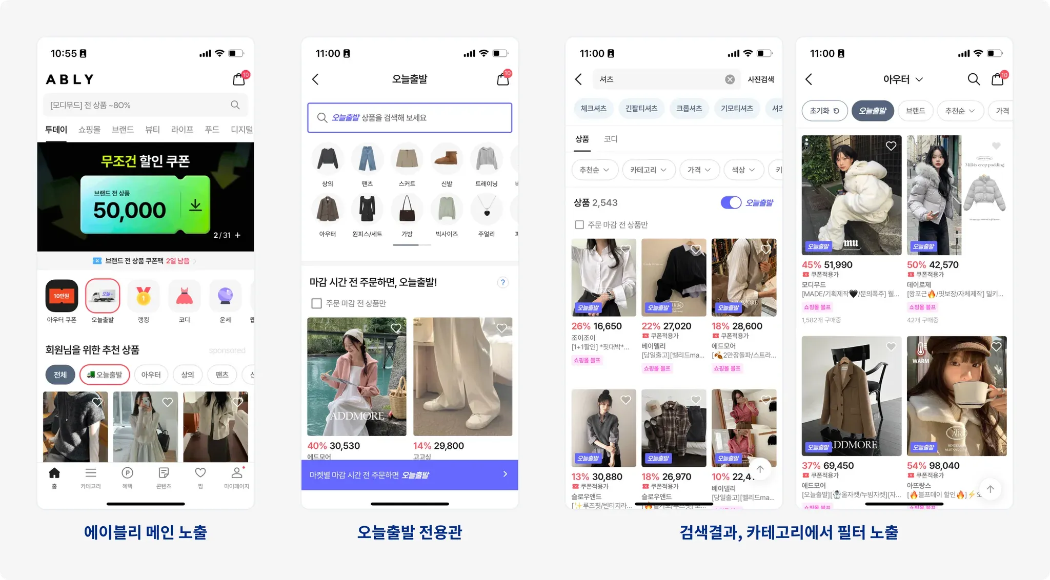 에이블리 메인, 오늘출발 전용관, 검색결과 등 다양한 지면에서 더 많은 노출을 선점할 수 있어 연말 쇼핑 고객들의 많은 유입을 기대할 수 있습니다.