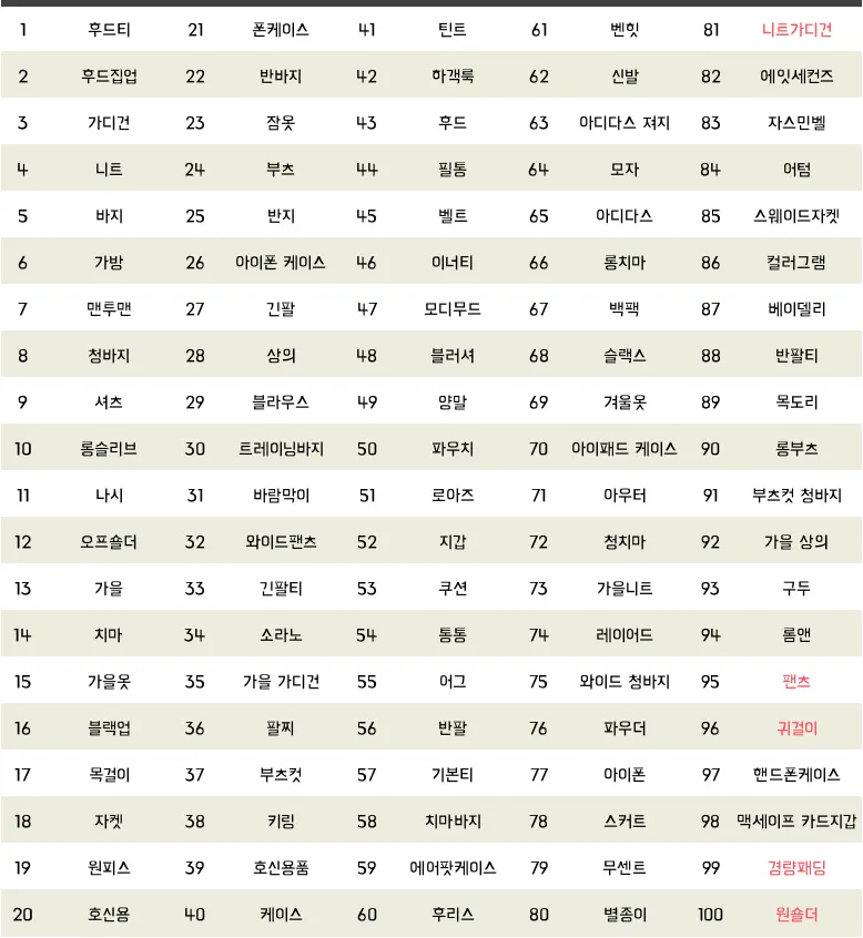 * 적색 표시 : New 진입 키워드 (니트가디건, 팬츠, 귀걸이, 경량패딩, 원숄더)