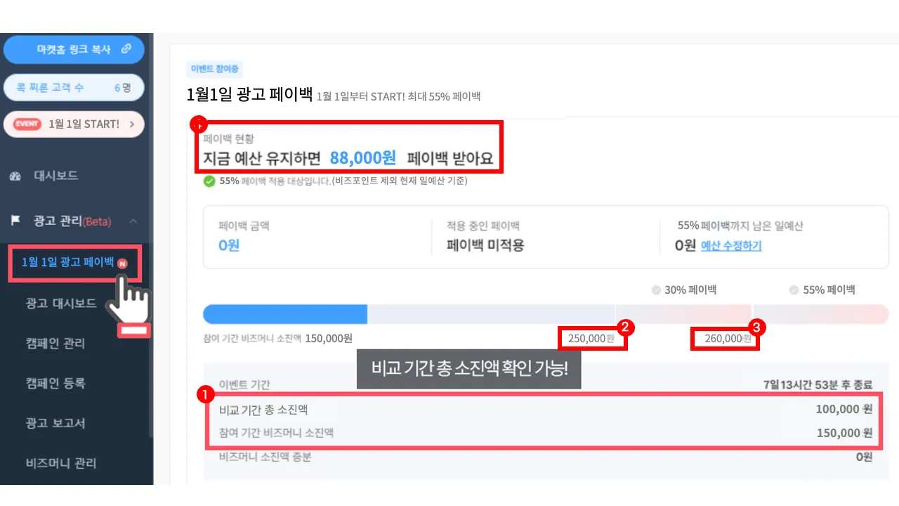 이번 1월 1일부터 START! 페이백의 비교 기간도 11월 초이므로 비교 기간보다 공격적인 광고비 투자로 신년 성과도 확보하고, 최대 55% 페이백도 받아가시기 바랍니다!