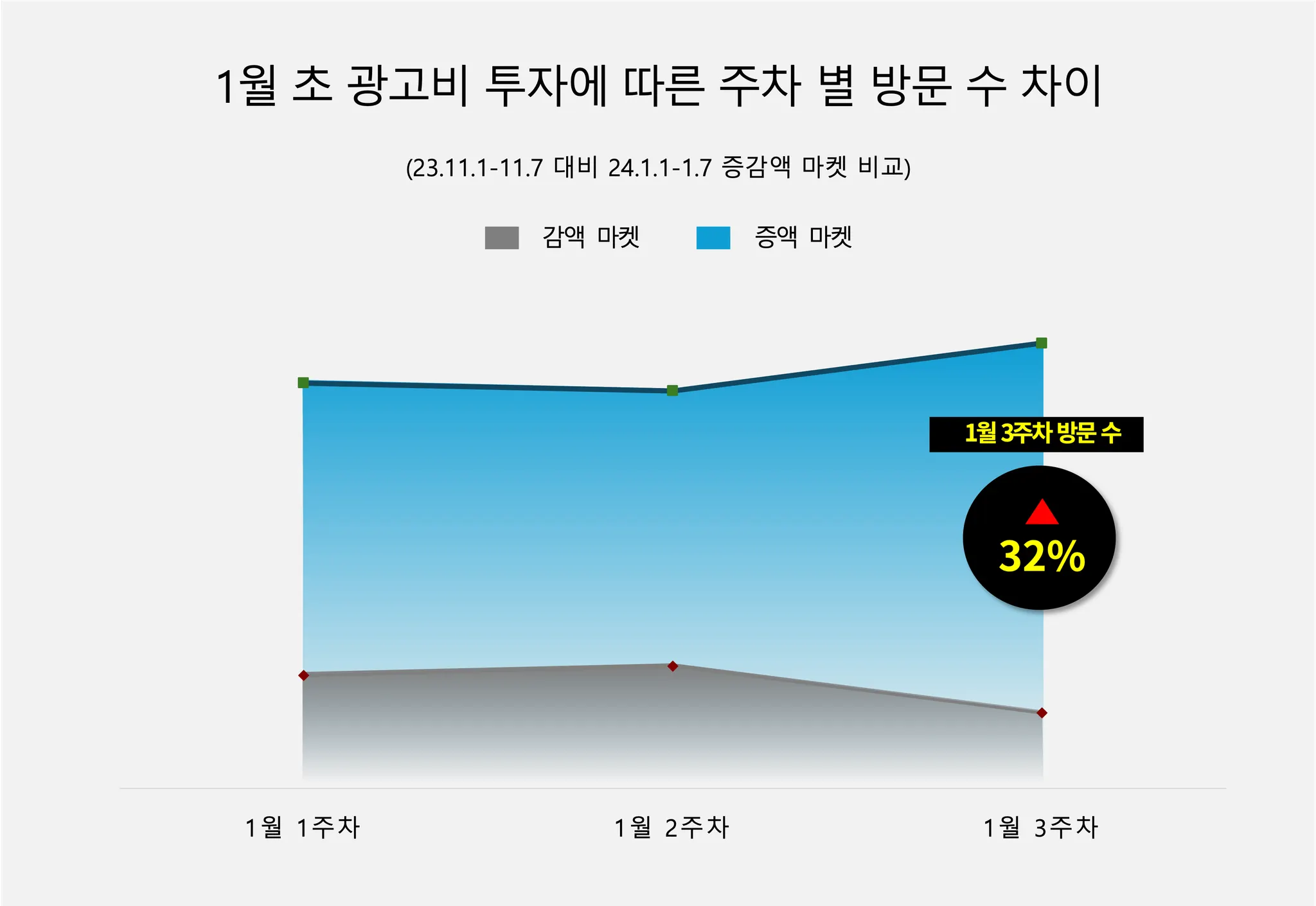 작년 1월 초에 열심히 광고비를 증액한 마켓은 인기 상품을 미리 만들어 두었기에 1월 주차 별 방문자 수가 점차 성장했습니다. 그에 반해 월 초 광고비를 투자하지 않은 마켓은 주차 별 방문자 수가 소폭 하락했습니다.