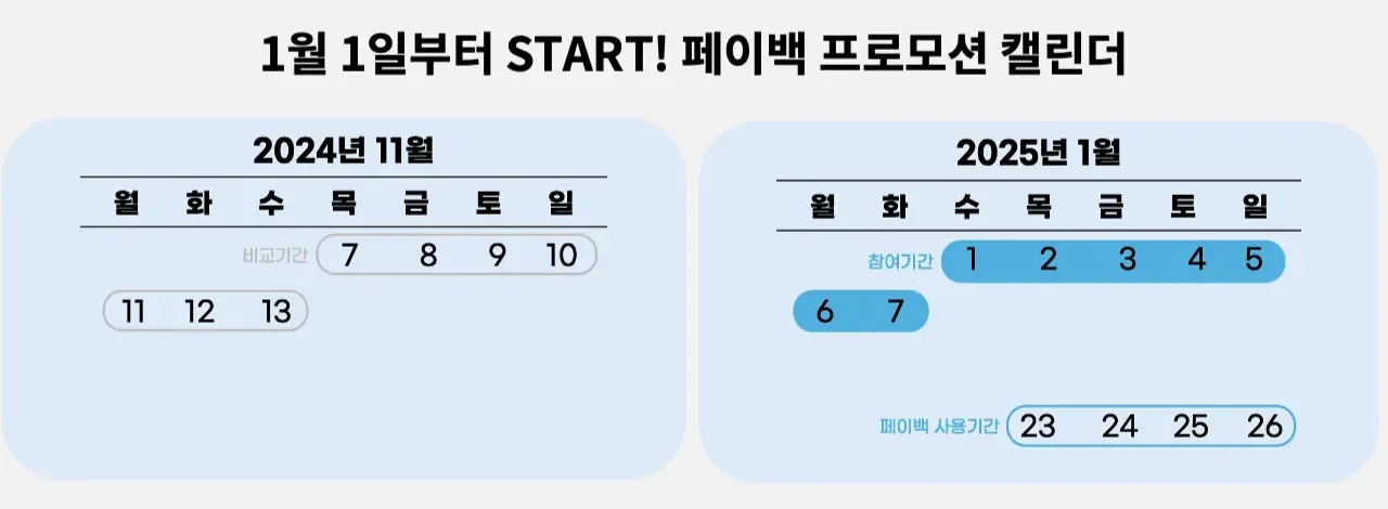 페이백 사용기간 | 25년 1월 23일 목요일 지급 | 25/01/23 (목) ~ 25/01/26 (일) (4일) |