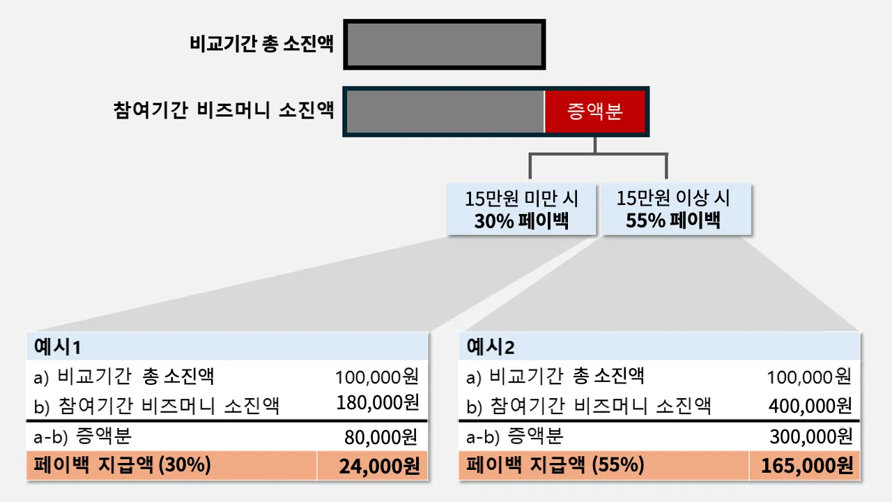 참여 조건 | 비교 기간 총 소진액 대비 참여 기간 비즈머니 소진액 1원 이상 증가