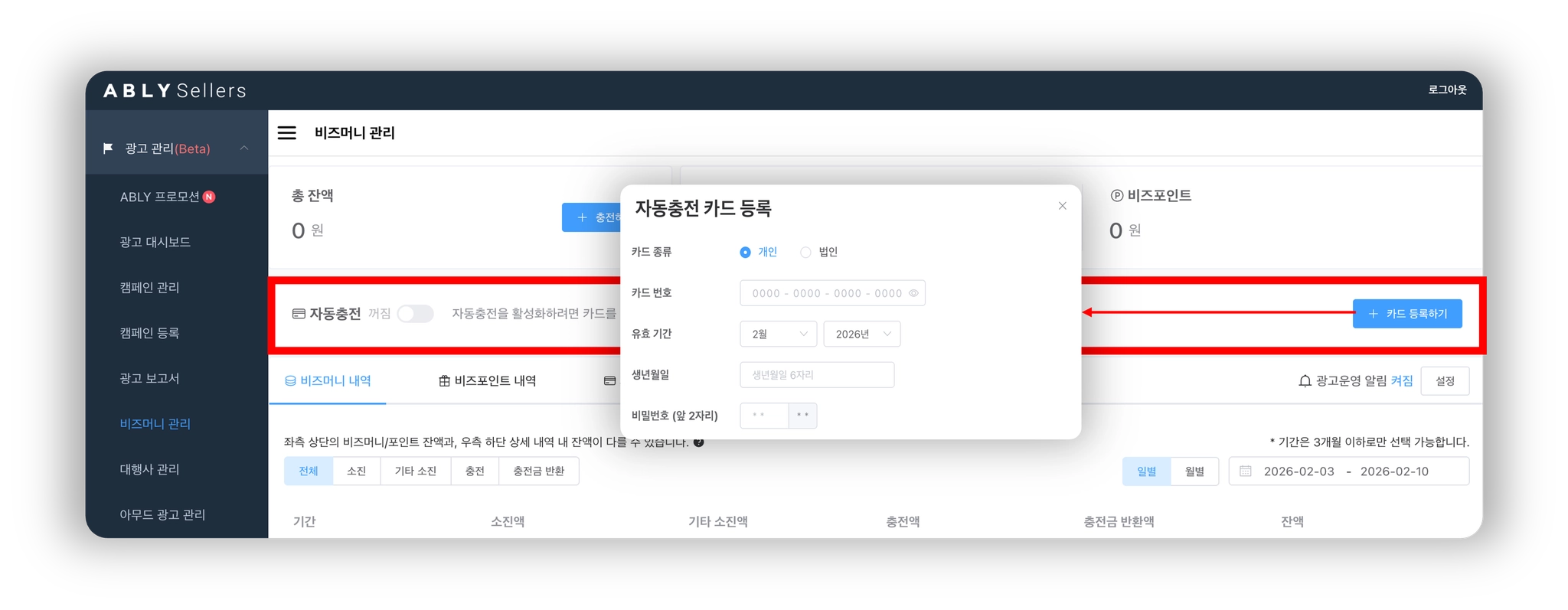 자동 충전은 비즈머니 잔액 부족으로 광고 노출 중단이 예상될 경우, 미리 등록한 카드로 설정한 금액만큼 비즈머니가 자동으로 충전되는 기능이에요.