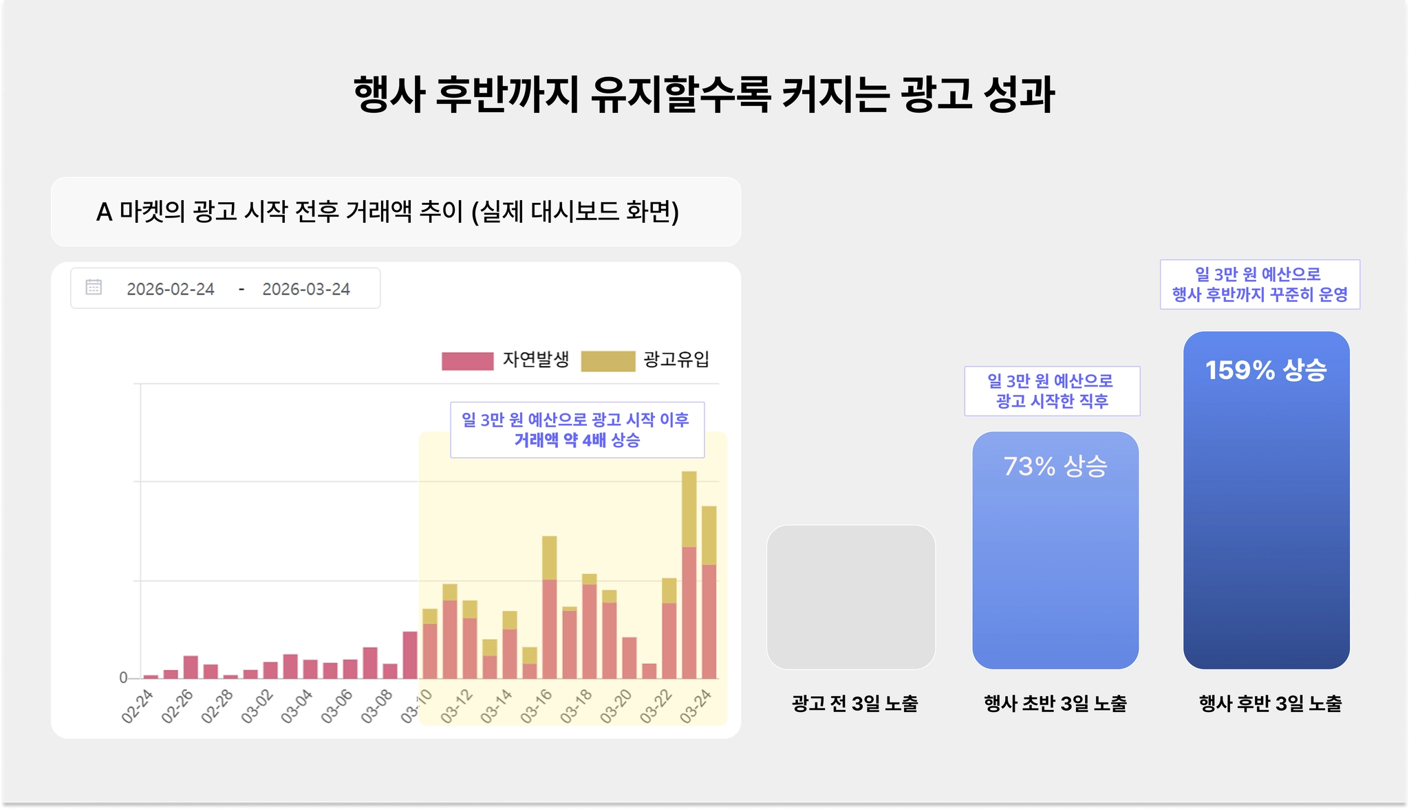 실제 A 마켓은 최근 행사 기간 동안 일 예산 3만 원으로 광고를 꾸준히 운영한 결과, 행사 전 대비 거래액이 4배 증가하고, 종료 이후에도 높은 거래액을 유지하고 있어요. 광고 상품 선별 전략