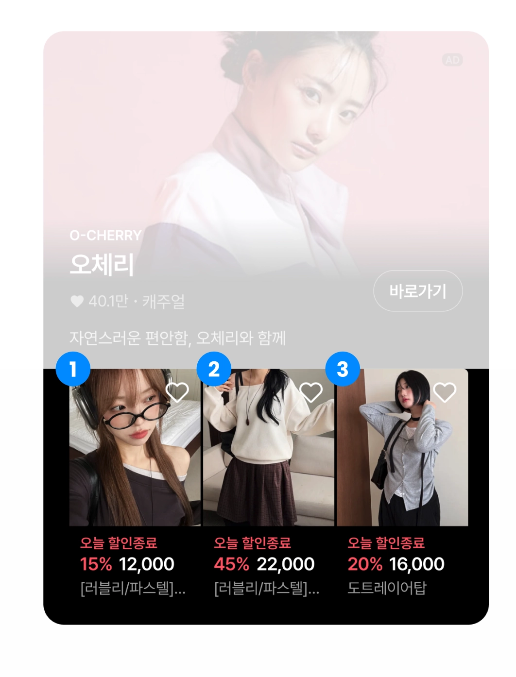 왼쪽부터 총 3개의 상품 카드를 노출 할 수 있습니다. 누를 경우 해당 상품 상세로 이동합니다.