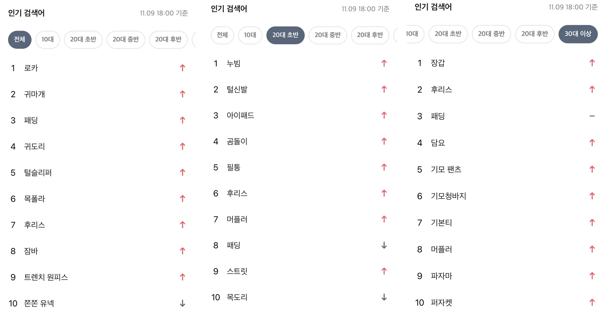 (데일리모어 상품 상세페이지 최상단에 안내된 상품세트 구성(좌측)과 에이블리 인기검색어(우측))