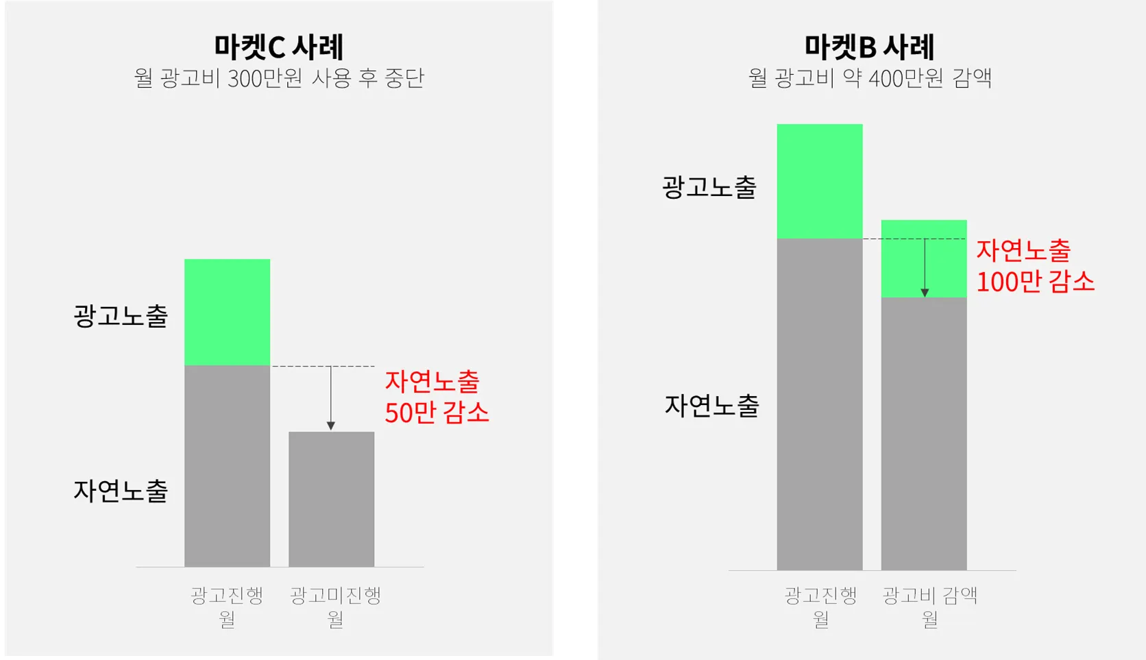 광고를 중단하거나 광고비를 줄이는 경우 감소한 광고비만큼 광고 노출이 빠져야 하지만, 자연 노출이 함께 감소하는 상황이 발생하였습니다.