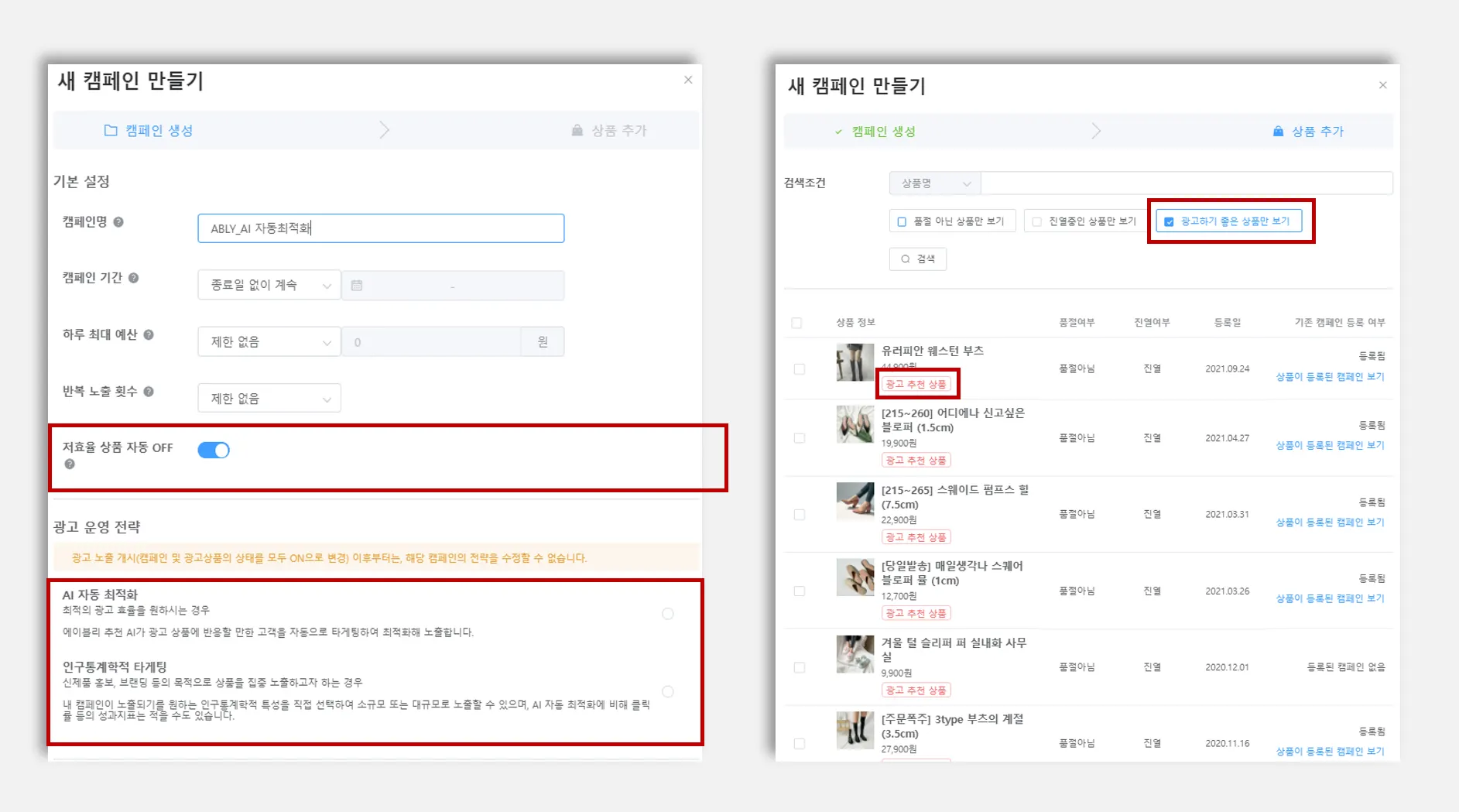 (캠페인 생성 시 저효율 상품 OFF 기능 활성화와 광고 운영 전략 선택이 손쉽게 가능하며, 광고하기 좋은 상품만 선택해서 볼 수 있는 기능이 제공된다)