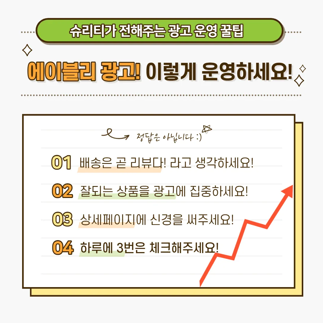 하나, 긍정적인 리뷰를 모으려면 우선 배송이 빨라야 합니다. 그러니 빠른 배송이 어려운 상품은 가급적 광고를 피하면 좋을 것 같아요.