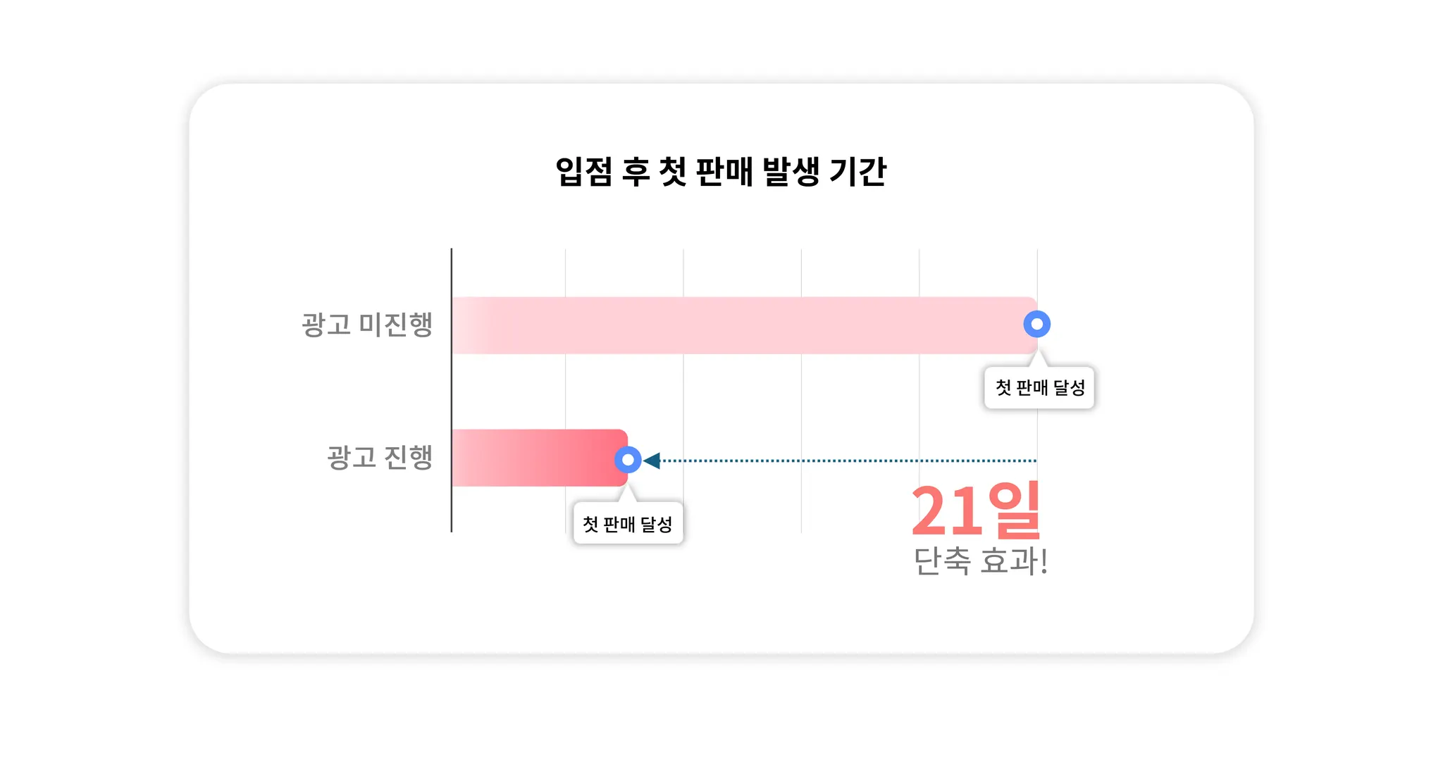 이제 막 입점을 하신 셀러분이라면 첫 판매를 간절히 기다리고 계실텐데요. 광고 진행 마켓은 광고를 진행하지 않는 마켓 대비 평균 21일 빠르게 구매 고객을 만날 수 있습니다.