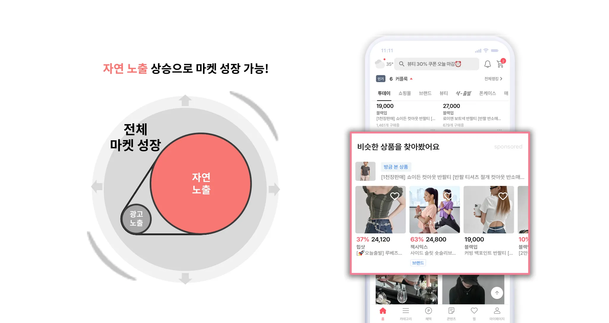 광고 노출로 클릭, 상품찜, 판매, 리뷰 등의 고객 반응을 얻게 되면, AI 추천 엔진이 이를 긍정적으로 해석하여 해당 상품과 마켓을 더 많이 노출 시켜줍니다. 이렇게 발생한 자연 노출이 자연 매출로 이어지고, 이는 다시 노출 증가로 이어지게 됩니다.