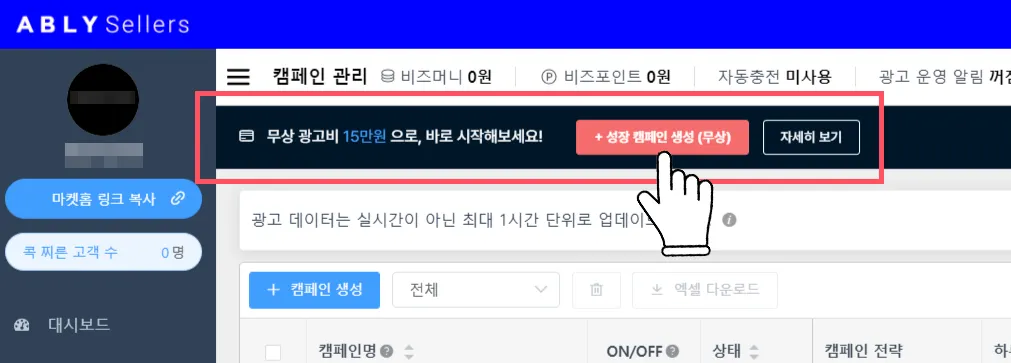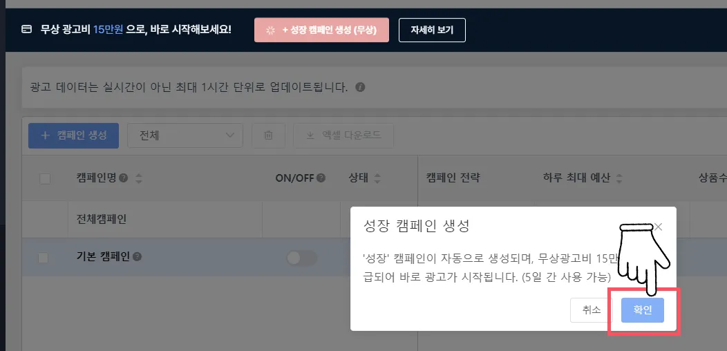 셀러 어드민 내 광고 관리 - 캠페인 관리 화면 상단 “성장 캠페인 생성” 버튼을 누르면, 자동으로 캠페인이 생성되고, 동시에 비즈포인트 15만원이 충전되어, 바로 광고가 시작됩니다.