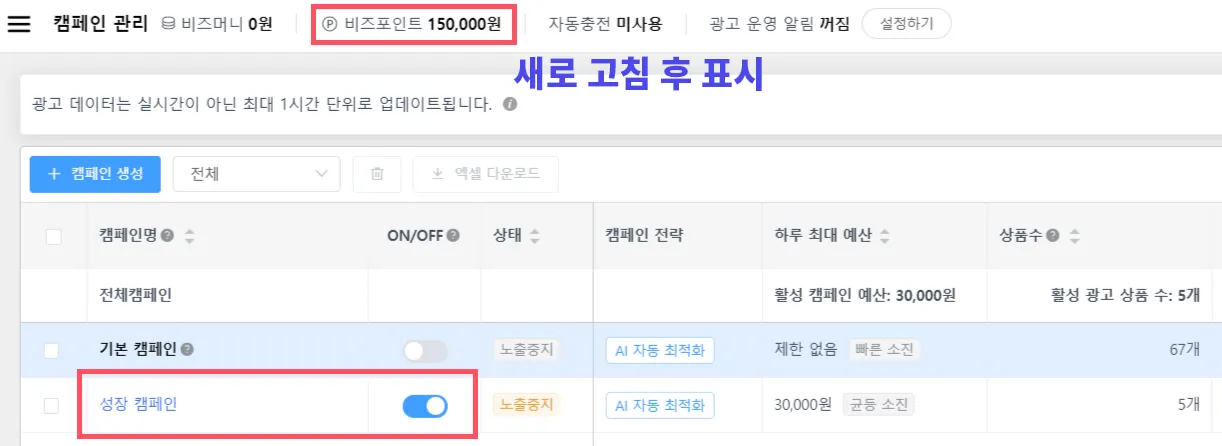 성장 캠페인이 아닌 새 캠페인 등록으로 광고를 시작하는 경우 비즈포인트 지급이 불가합니다.