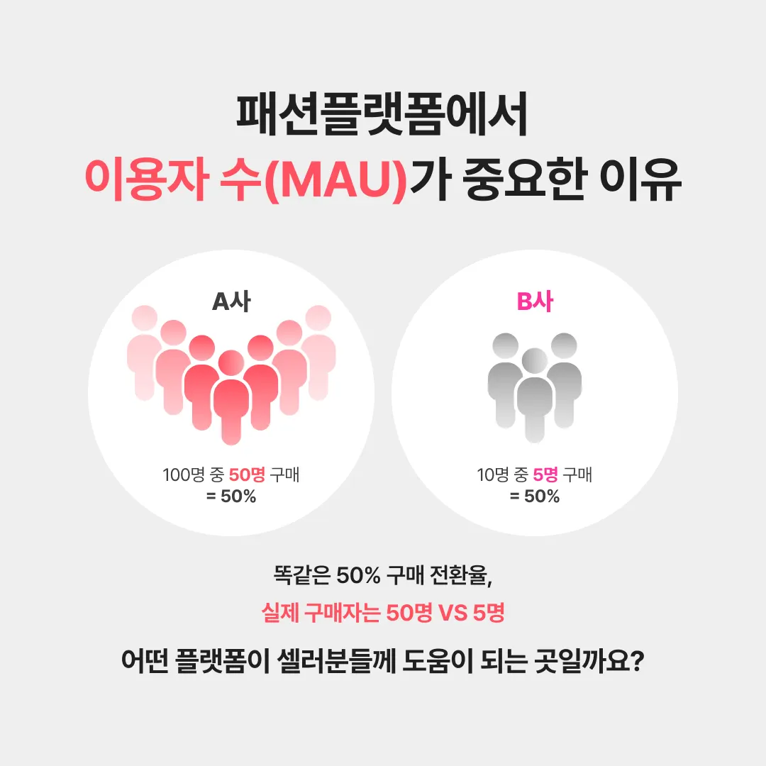 이런 상황에서 구매 전환율이 똑같거나 유사하다면 이용자 수가 많을수록 구매 수는 더욱 기하급수적으로 많아지는데요!