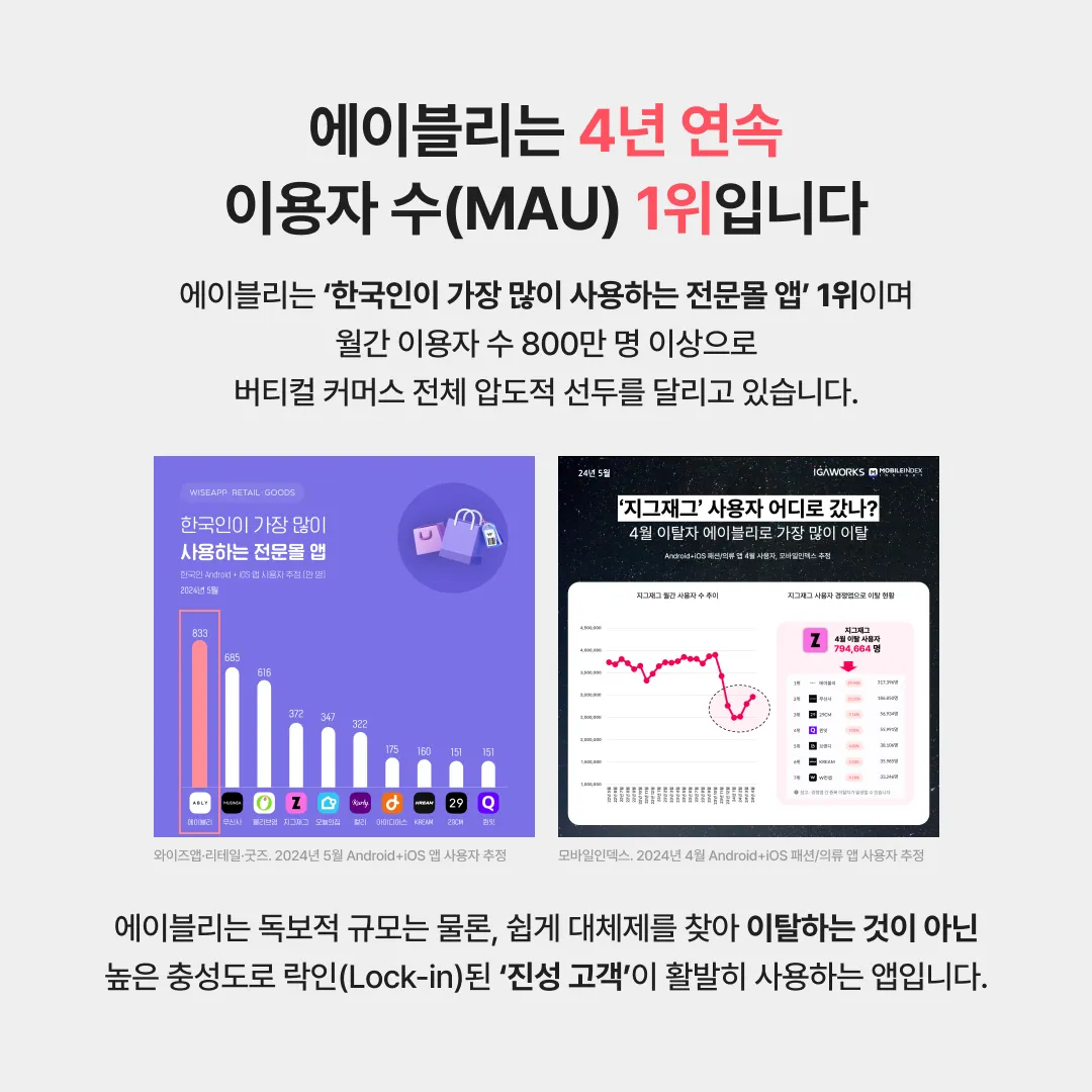 에이블리는 무려 4년 연속 이용자 수(MAU) 1위를 유지하고 있는, 전 세대에서 사랑 받는 부동의 버티컬 커머스 전체 1위 앱인데요!