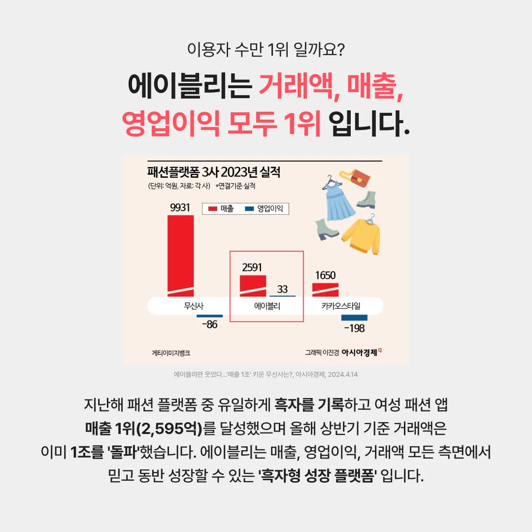 에이블리는 폭발적인 이용자 수 성장에 집중하고 이를 이뤄내며, 셀러님과 함께 성장하는 1위 여성 패션 플랫폼으로 거듭났습니다.