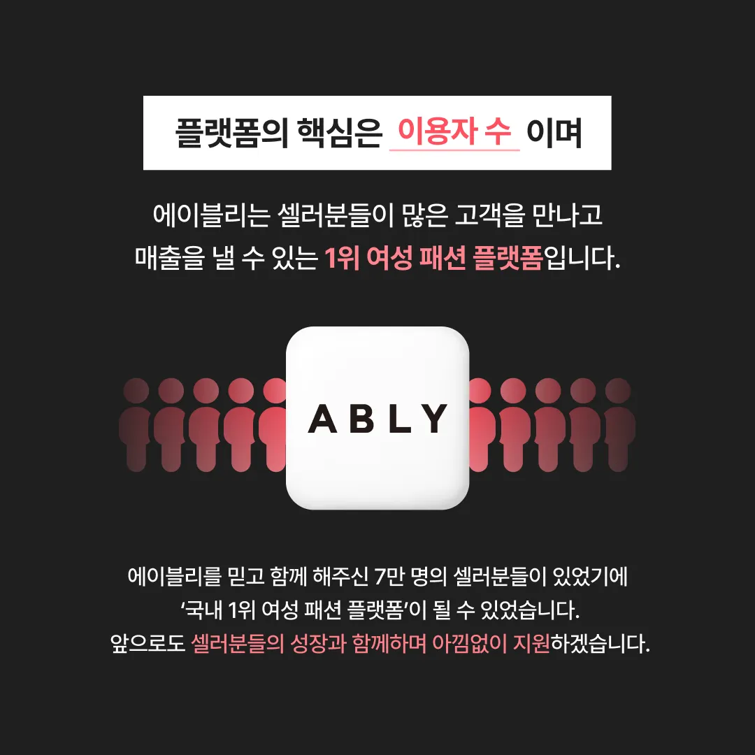 에이블리는 앞으로도 셀러님께서 믿고 함께하실 수 있는 1등 플랫폼이 될 수 있도록 지원을 아끼지 않을 예정입니다.