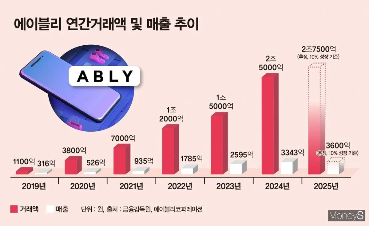 에이블리는 2024년 매출액 3,343억 원을 기록하며 연간 28.8%이라는 큰 폭의 성장을 달성했어요. 2021년(935억 원) 대비 3년 만에 매출 규모가 3.5배 성장한 셈이에요. 연간 거래액(GMV) 역시 2024년 2조 5,000억 원을 돌파했으며, 업계는 올해 연간 거래액이 2조 7,000억 원에서 3조 원을 넘어설 것으로 전망하고 있어요.