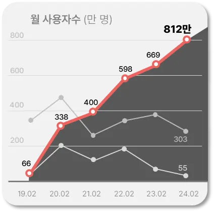 플랫폼의 높은 MAU는 전체 시장 내에서 높은 비중을 차지고 있음을 의미합니다. 성장하는 플랫폼은 계속해서 이용자가 유입되기 때문에, 광고 투자를 통해 해당 이용자를 내 고객으로 흡수하며, 경쟁사 대비 우위를 점할 수 있는 기회를 얻게 됩니다. 브랜드 인지도와 고객 기반 확장에 유리한 조건을 제공하여, 전체 시장에서의 점유율을 높이는 결과를 얻을 수 있습니다.