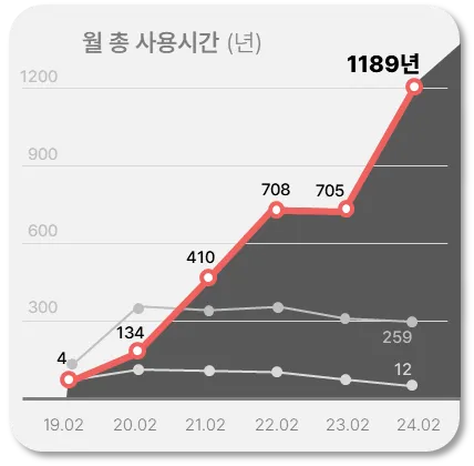 스타일 커머스에서 후발 주자였던 에이블리는 해마다 가파른 성장을 통해, 이제 타 버티컬 앱과 비교하기 어려울 정도로 높은 시장 영향력을 발휘하고 있습니다. 이용자 규모 뿐만 아니라 사용시간, 실행횟수 등 앱 이용률 수치를 비교해 보더라도, 에이블리 유저들이 얼마나 헤비 유저(Heavy User)로 활동하고 있는지 확인할 수 있습니다.