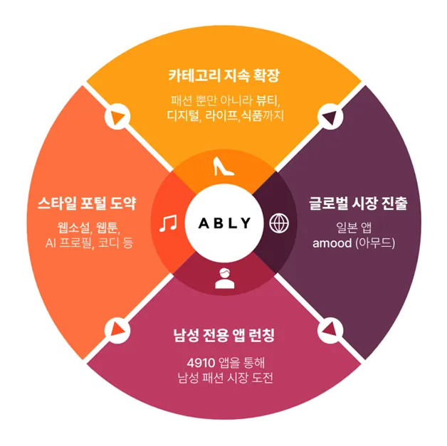 에이블리는 현재에 머무르지 않고, 계속해서 더 큰 성장을 위해 도전하고 있습니다. 2023년도 어려운 시장 환경 속에도 남성 패션 플랫폼 ‘4910’을 런칭하였고, 일본 패션 앱 ‘아무드’에 대한 투자를 강화하며 글로벌 시장 공략에도 속도를 늦추지 않았습니다. 웹툰/웹소설 서비스 출시를 필두로 스타일 커머스에서 스타일 포털로의 성장을 이어나갈 전망입니다.