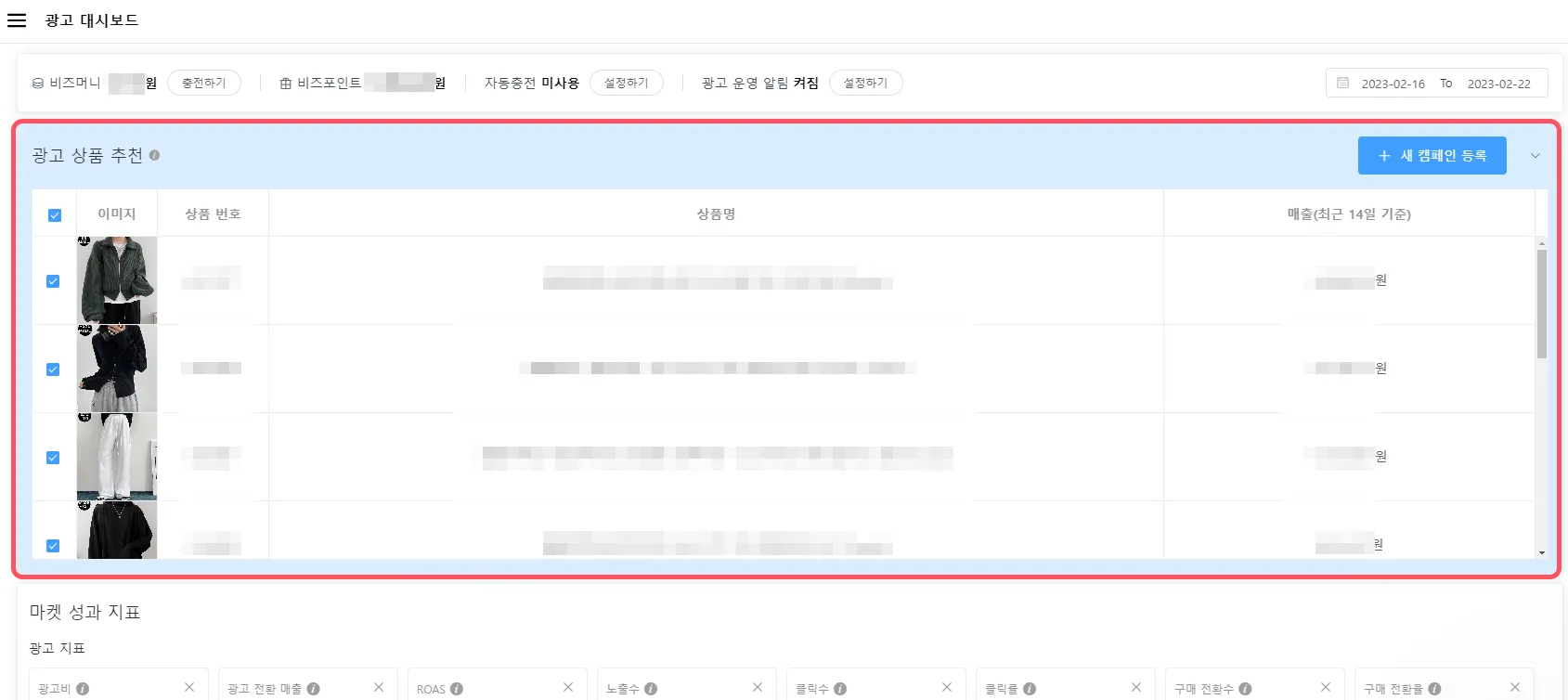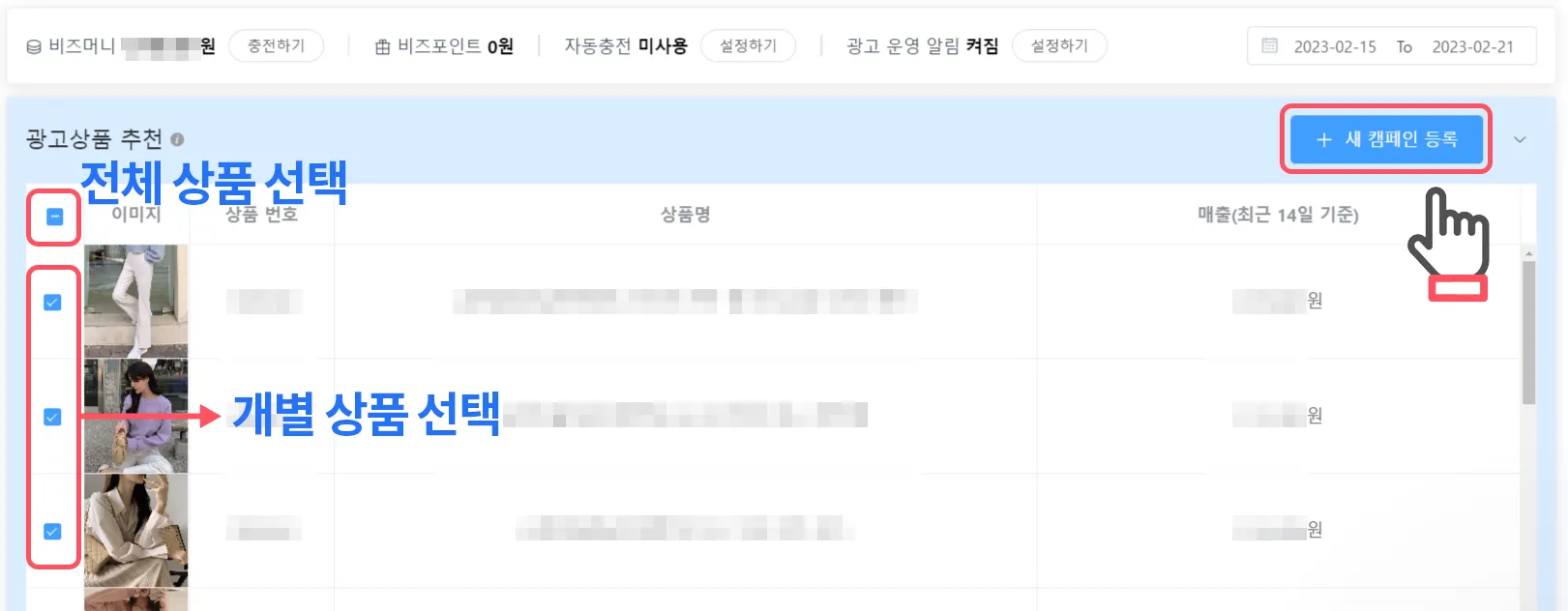 광고할 상품을 선택하고 ‘새 캠페인 등록’ 버튼을 클릭해주세요.