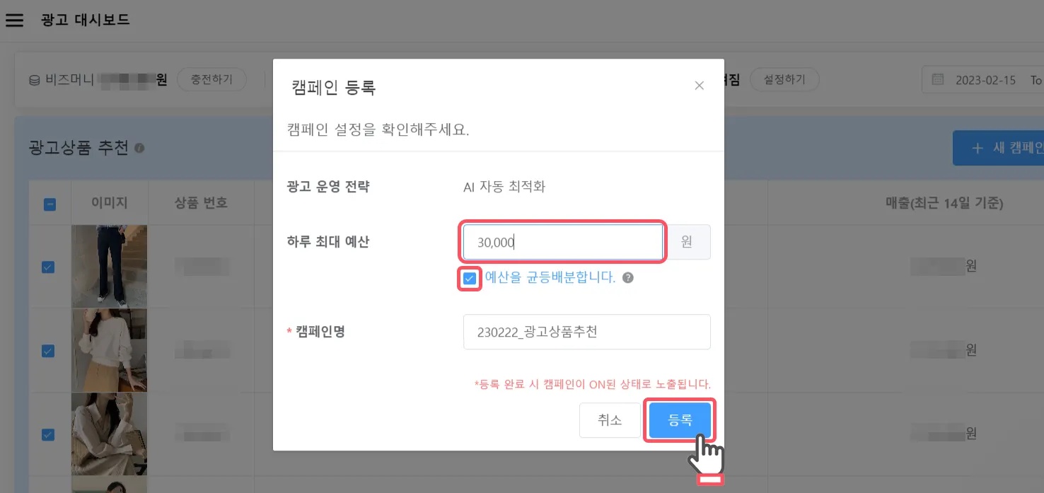 하루 최대 예산은 1만원부터 입력이 가능하고, ‘예산 균등 배분’ 버튼도 선택해주세요.
