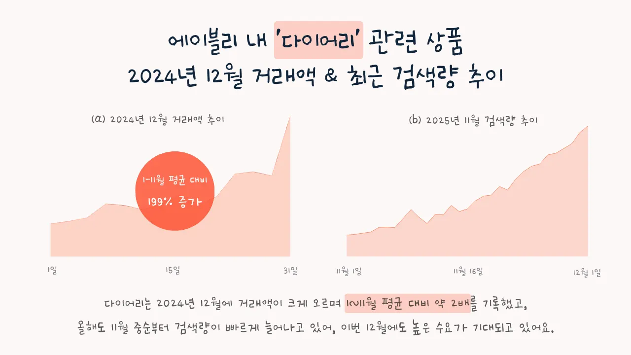 11월 중순부터 높아지는 관심과 함께, 12월의 다이어리는 다른 달 대비 거래액보다 2배까지 뛰는 확실한 효자 아이템이에요.