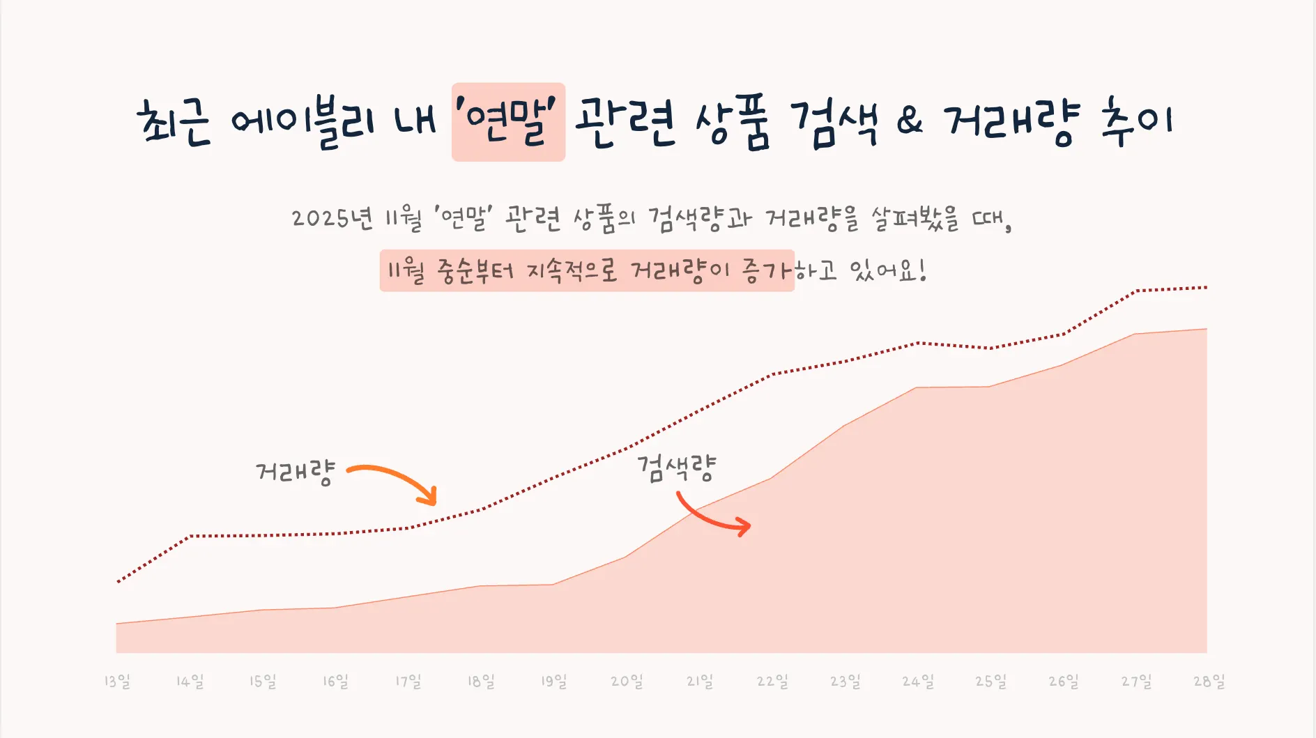 2024년 에이블리 기준으로 ‘연말’ 관련 상품은 11월 중후반부터 꾸준히 상승하다가, 12월에는 크리스마스까지 폭발적으로 거래량이 증가하는 흐름을 보였어요.